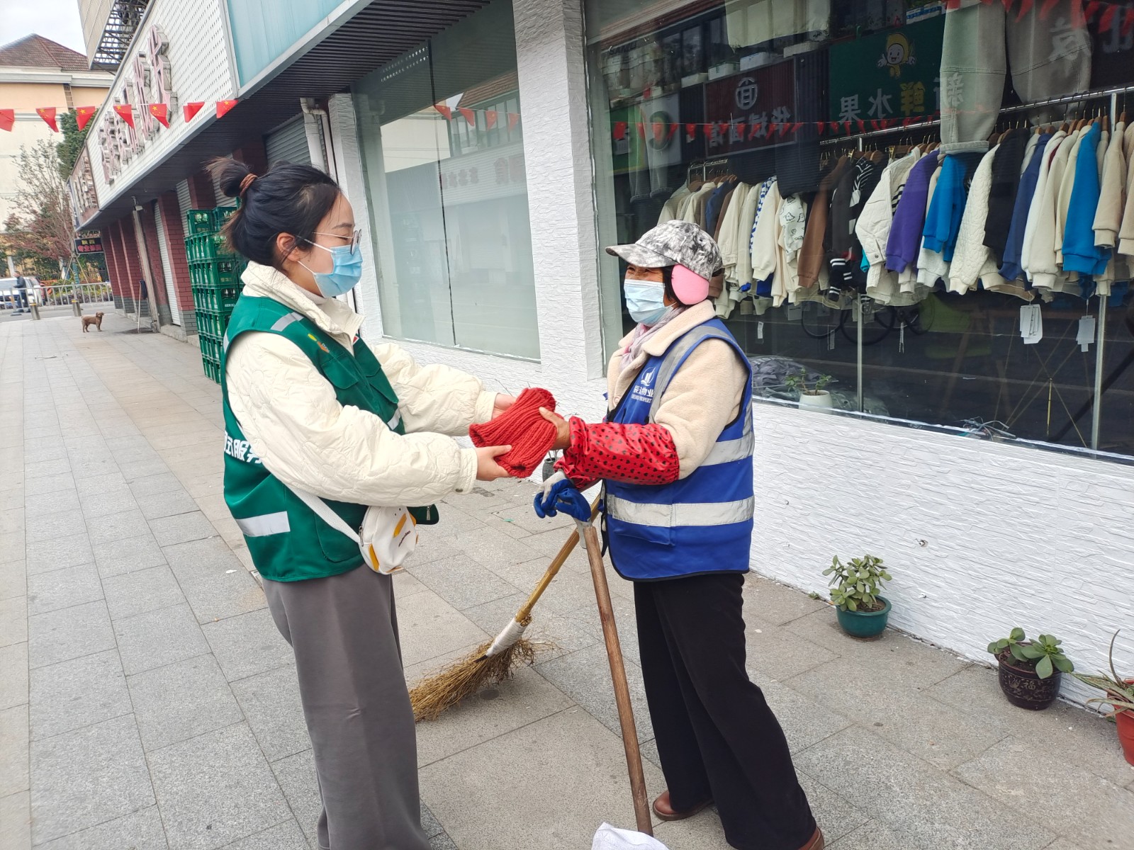 带着钩织社阿姨的嘱托,俞范社区网格员们和志愿者将这些“小红帽送到了桶边督导员和保洁员手中。