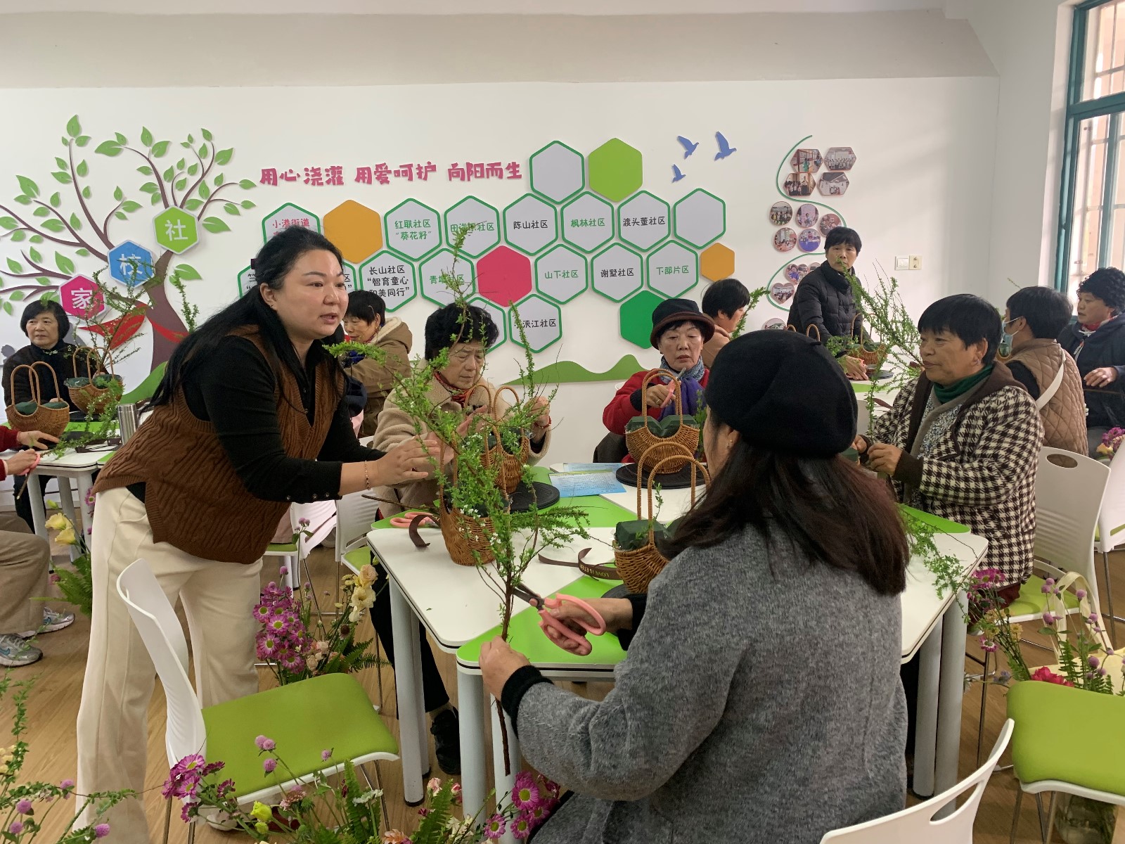 活动现场花香四溢,首先专业的花艺老师为大家详细介绍了花材的选择与处理方法以及不同的花材在整体花篮中的作用着,在花艺老师的示范带领下,各位退休居民也开始了自己的花艺之旅。有的喜欢色彩鲜艳的,有的注重整体和谐的,还有的喜欢含苞待放的,每个人发挥着自己的想象力和动手能力,打造独一无二的花艺作品。