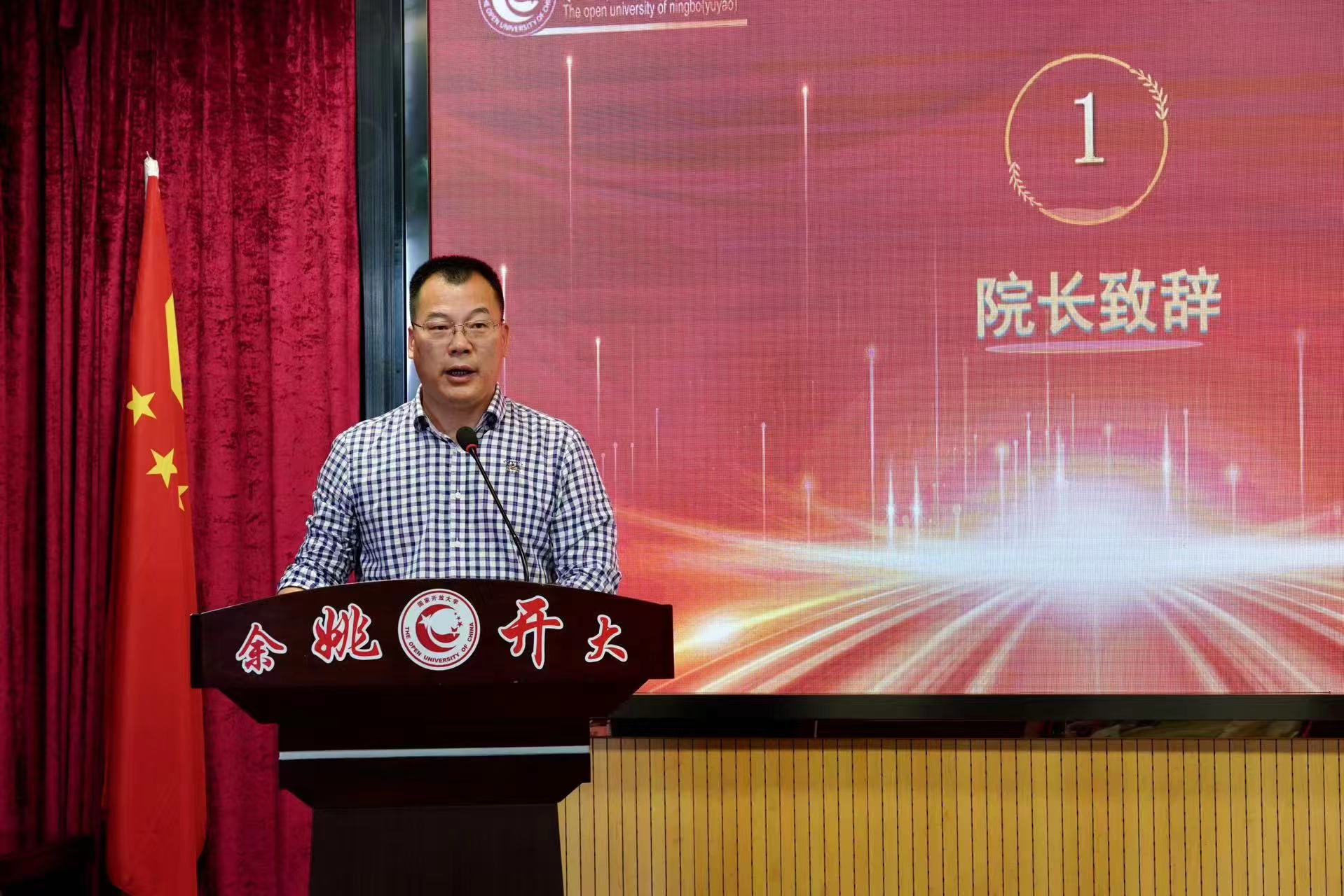 随后,沃其洪院长在致辞中回顾了余姚开大45年的辉煌历程和丰硕的办学成果,特别强调了学校在推动终身学习方面的不懈努力和卓越贡献。他以“四个学会”为新学员们送上了殷切的期望:学会学习,培养终身学习的理念;学会坚持,锻造持续学习的毅力;学会自信,坚定学以致用的信念;学会创新,激发创新创业的精神。他鼓励新学员们通过不懈的学习和奋斗,成为新时代自信自强的开大学子。