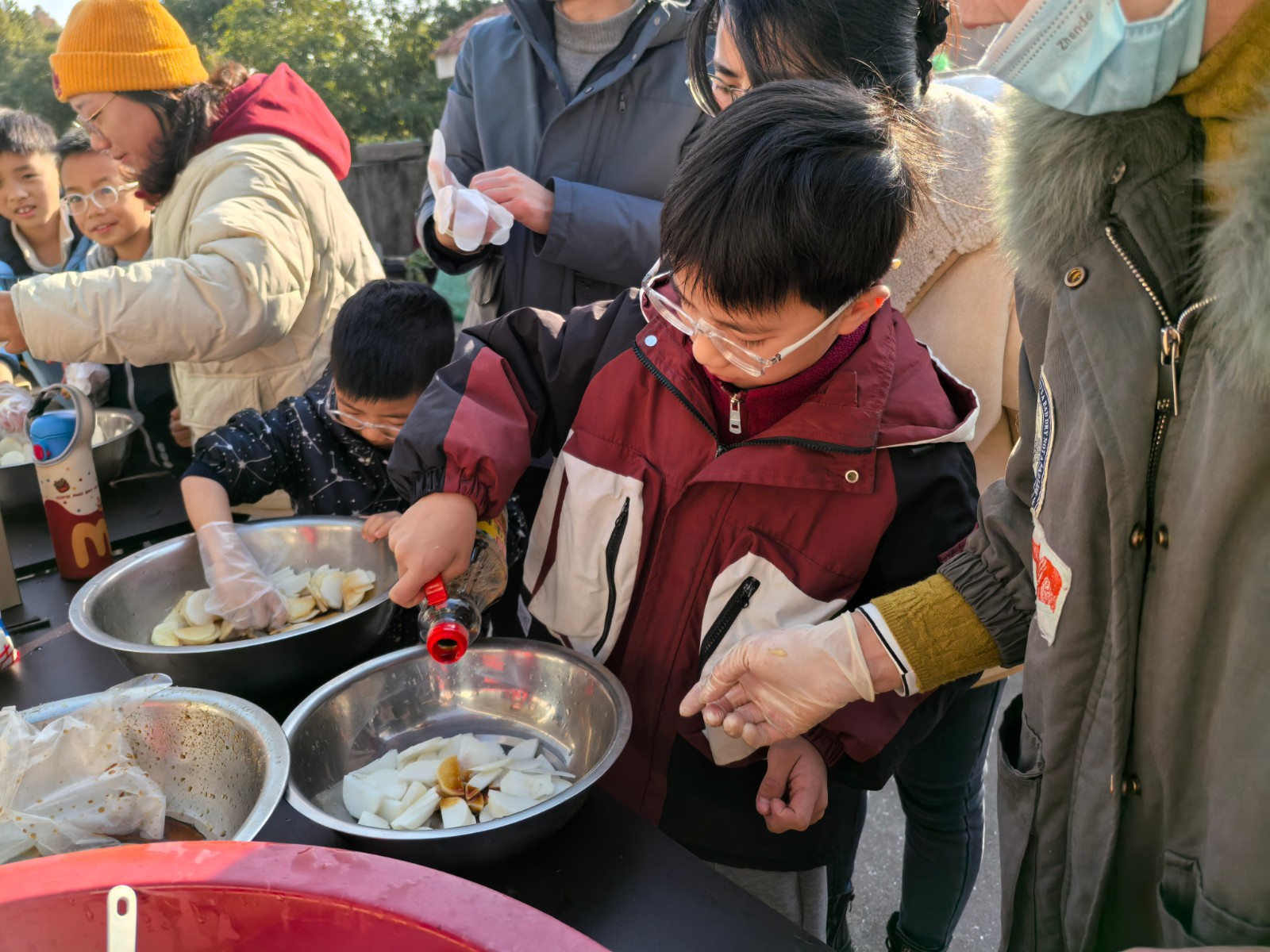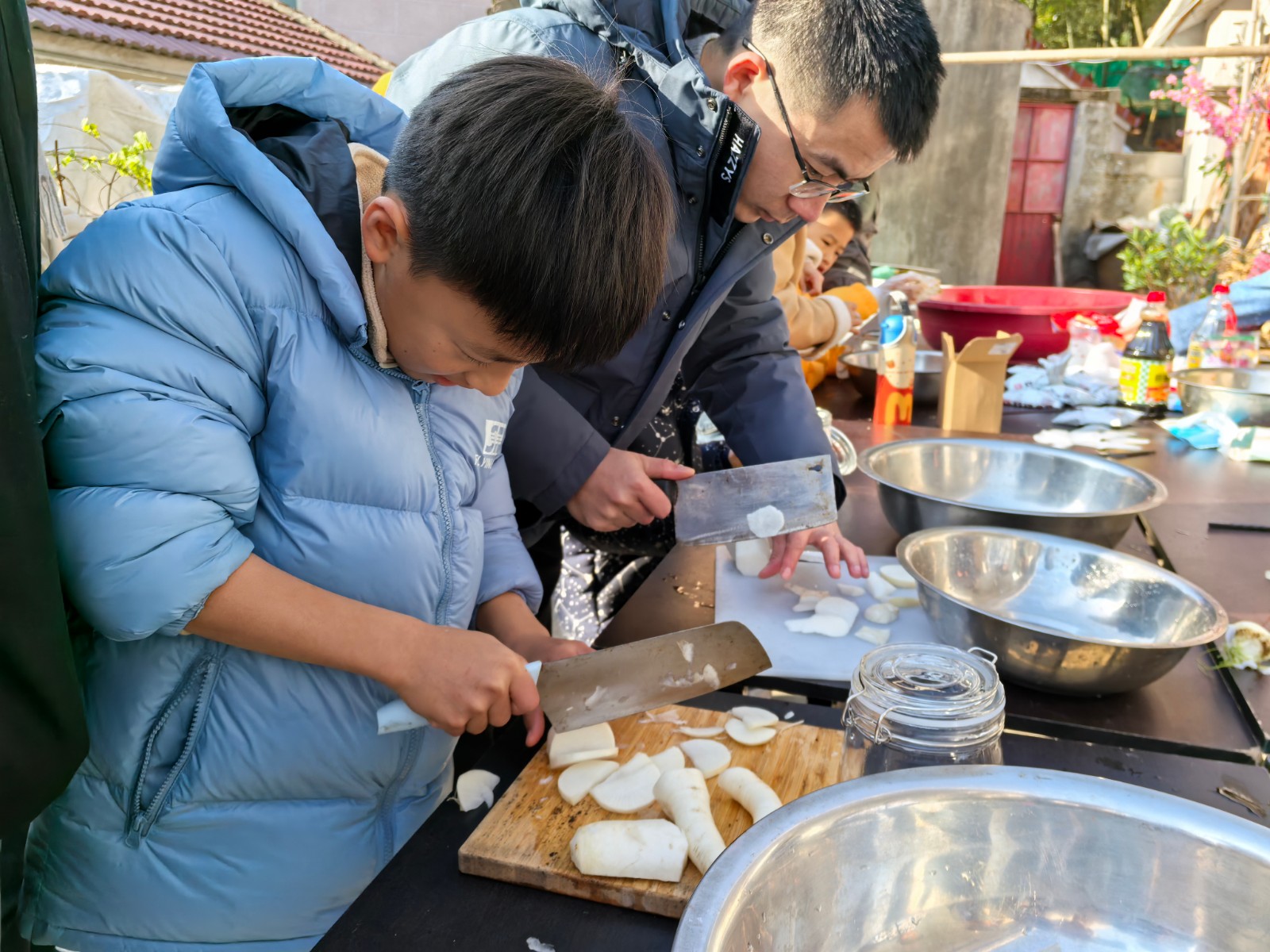 秋冬是萝卜丰收的季节,为深度体验农耕文化,让孩子重建与大自然的链接,12月15日,九龙湖村妇联组织12组亲子家庭在红色线路的庭院课堂内开展。本次活动需要小朋友在父母的帮助下,前往田头拔一只萝卜把它清洗干净并制作成腌萝卜。小朋友们听说要自己拔萝卜顿时兴奋不已。大家迫不及待下到田头,根据萝卜叶的大小选定萝卜后,抓住叶子使劲一拔,一个完整的萝卜就出来了。接着,小朋友们分批到小水塘洗干净萝卜就正式进入腌制萝卜的环节。在庭院女主人邱奶奶和巾帼志愿者的指导和帮助下,小朋友们和父母协作,拔萝卜切成薄度适中的一片片,加入盐、醋、糖等调味品进行腌制。静待几分钟后由小朋友装罐就完成了。最后,邱奶奶还邀请小朋友们品尝了自家种的烤红薯。此次活动不仅让小朋友们了解了萝卜从土地到餐桌的耕食过程,还锻炼了他们的动手能力和团队合作精神。通过实地体验全程参与制作的方式,让孩子们在自然课堂中学习和成长。
