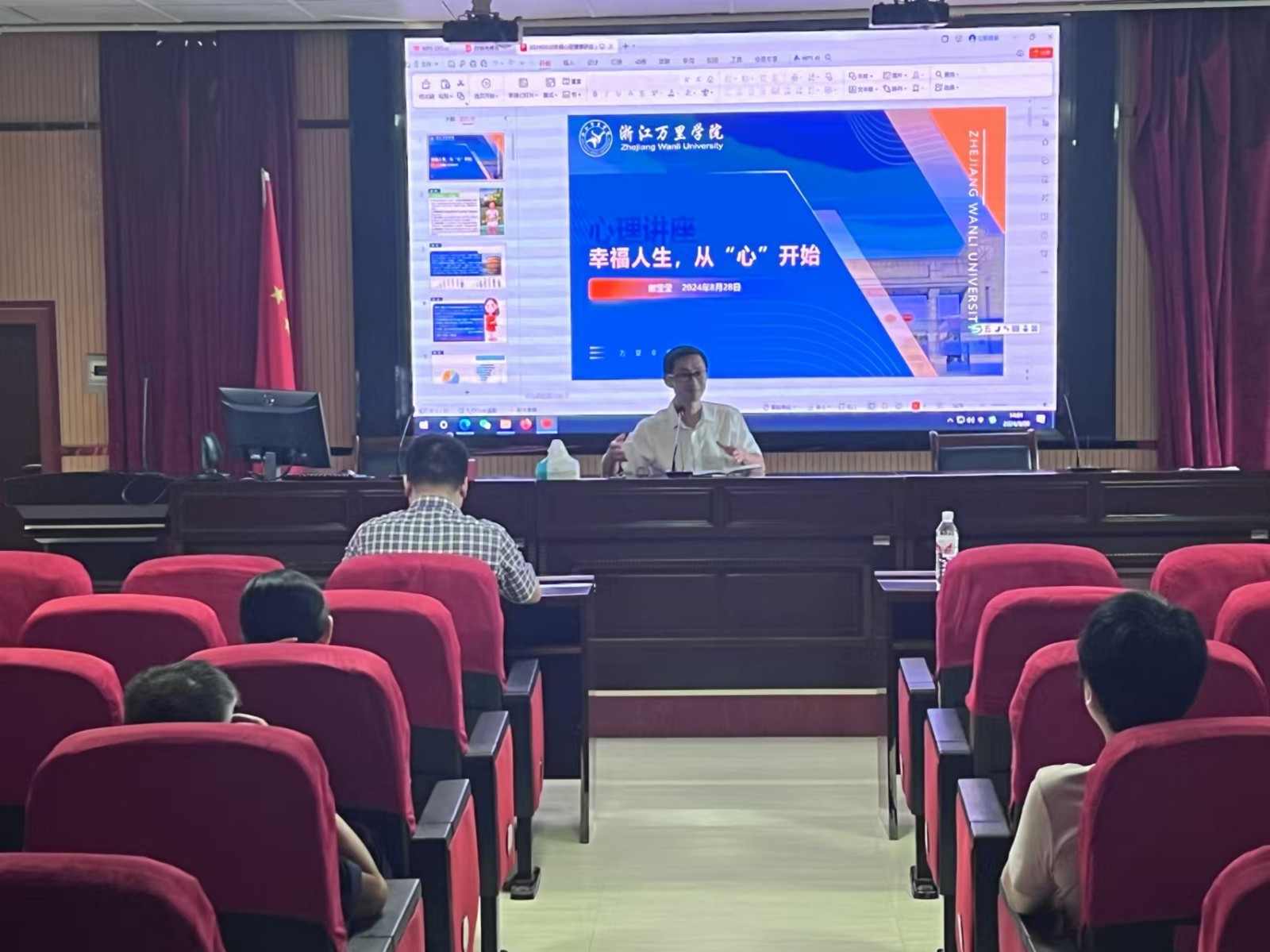 万里学院谢莹莹博士以《幸福人生,从“心”开始》为题,通过介绍心理健康的标准、中老年(教师)的心理特征、常见的心理问题及影响因素,引导老师们保持健康心态,做幸福的人。