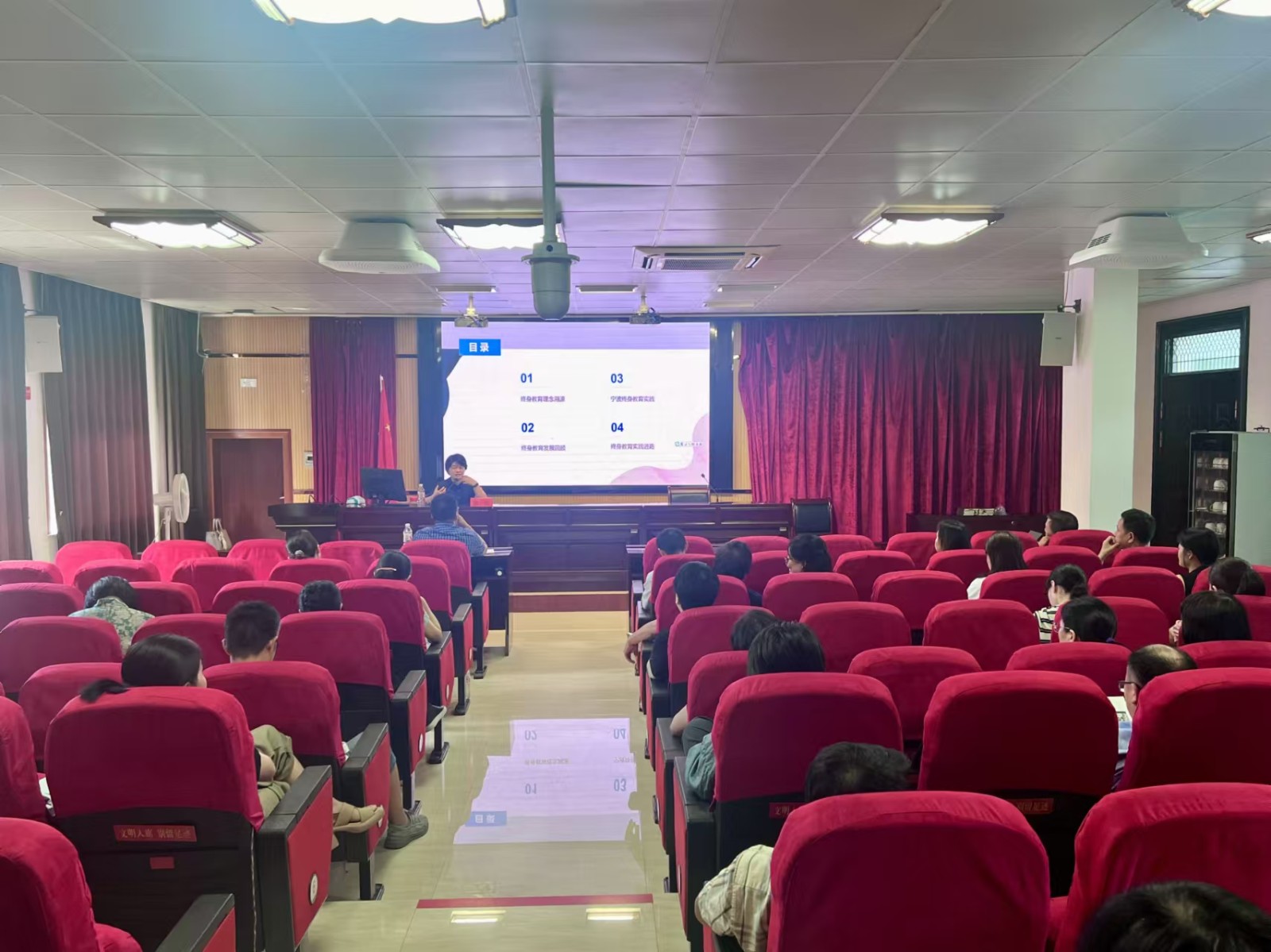 余姚市社科联秘书长谢建龙以“红色四明”为主题,通过介绍余姚抗战辉煌史迹和地方党史文化,激励老师学习先烈无所畏惧、无私奉献、勇往直前的革命精神。