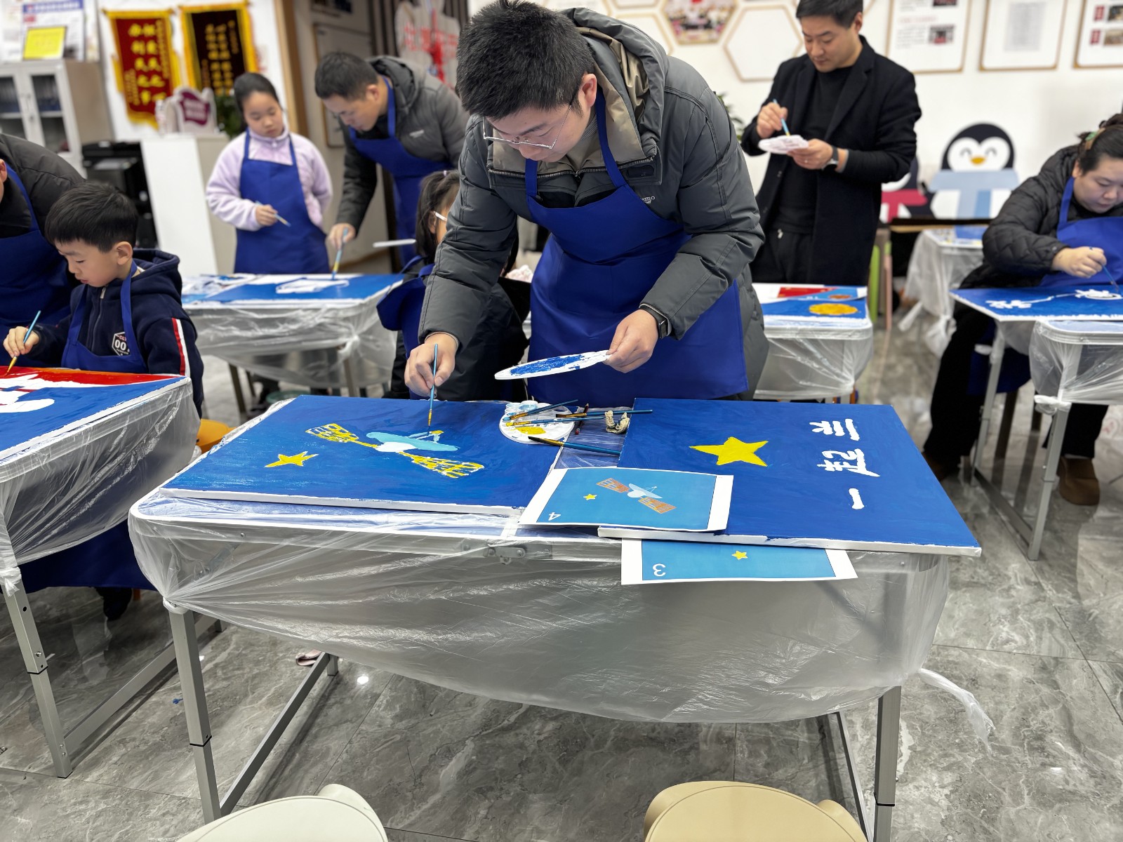 接下来是本次活动的重头戏 ——“绘梦星空” 巨幅画作创作。家长和孩子们拿起画笔,开始在画布上尽情挥洒创意。画作上有蓝色的地球、飞翔的火箭、闪烁的星星,每一笔都充满了对宇宙的向往和对航天梦想的追求。在创作过程中,家长和孩子们相互协作,有的负责勾勒轮廓,有的负责填充颜色,现场气氛和谐而热烈,充满了欢声笑语。