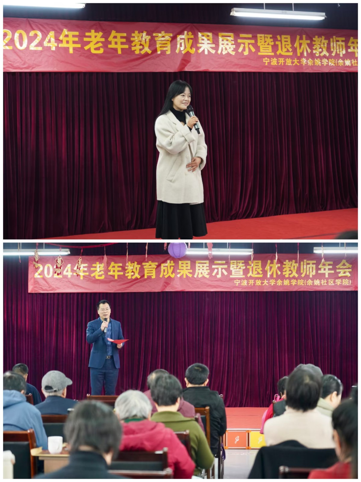 1226日上午,在欢快喜庆的乐声中,宁波开放大学余姚学院(社区学院)2024 年老年教育成果展示暨退休教师年会拉开帷幕。离退休教师们怀着喜悦之情,重返校园,一同观看精彩的成果演出,共叙往昔岁月,畅谈幸福晚年。