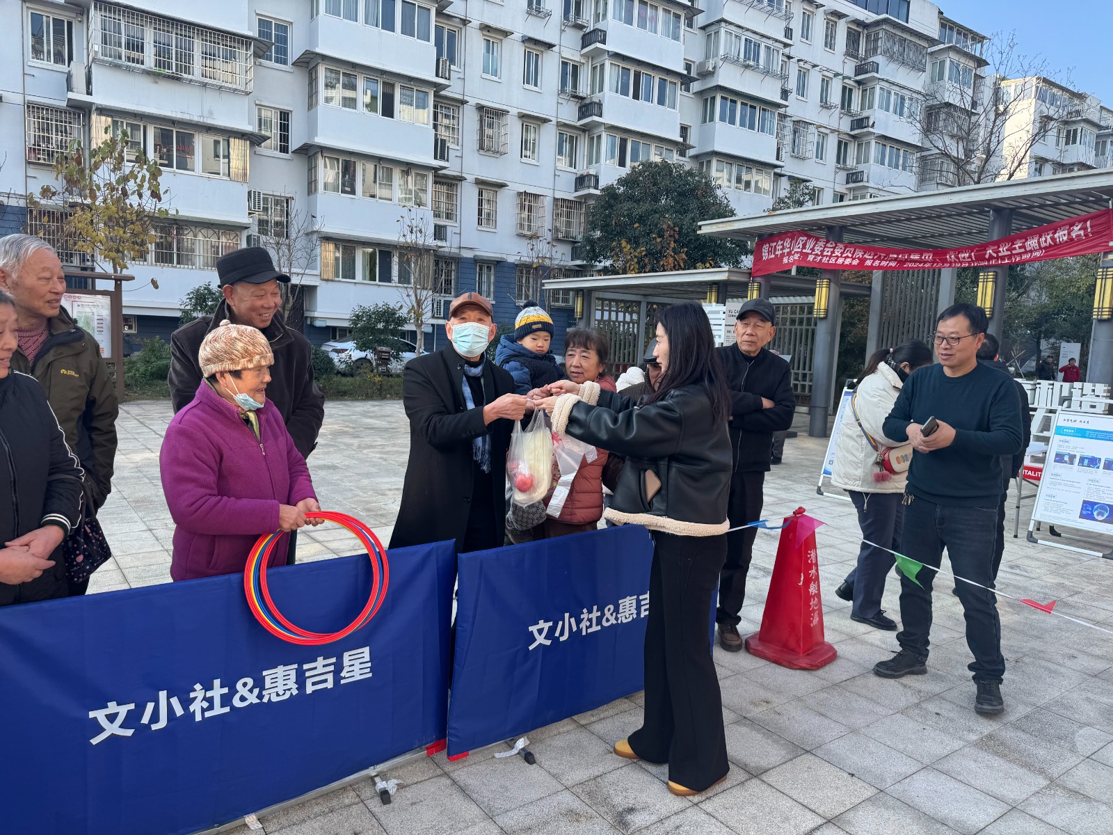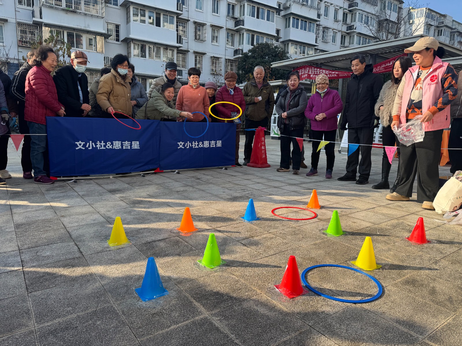 活动开始,社区网格员们将牙膏、香皂、各种蔬菜肉品等标识牌摆在地上规范的位置,在根据号码将套圈依次分发给各位居民,同时介绍了游戏规则:“每人有5个圈的机会,必须站在规定的线外,同时规定套中即得”。随着开始令下,选手们跃跃欲试,个个精神饱满,依次排队进行套圈,在围观群众的欢呼声中,有的一圈套中,有的多次尝试才套中,也有的与物品擦肩而过,还有的居民是实力派,直奔大奖而去。现场时不时传来阵阵欢笑声和欢呼声。“厉害,厉害,套了白菜和猪肉,午饭食材在了。”崔师傅兴奋地说道。套圈亦是“套”住幸福,也“套”住了欢乐。让大家在游戏活动中收获快乐,重温儿时的欢乐时光,展现老年人健康向上、充满活力的精神面貌,让每一个老人都在此时此刻享受着“老有所乐”。