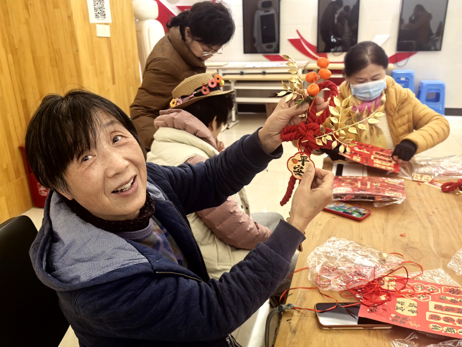 活动现场,活动老师先给各位居民分发粗红色麻绳、仿真石榴枝、金色铃铛、金叶子等材料。接着给大家示范制作步骤:先取一根红色麻绳制作万字节,接着把小铃铛,国风吉祥挂饰等自己喜欢的装饰元素一个个系在中国结上上,让福气扑面而来。最后把仿真石榴枝修剪一下,错落有致地穿插在中国结周围,就像把春天提前迎进家门,红红的超好看。万字节做好的那一刻,年味儿“噌”就上来了!居民们拿着自已精心制作的万字节,笑容满面,心中甜蜜,仿佛寄托了大家美好的新年愿望,为即将到来的新年增添一抹亮色和新年的气息。活动结束后夏阿姨手万字节,满足地说:“新年第一个万字节安排上啦2025年大吉大利,红红火火。”