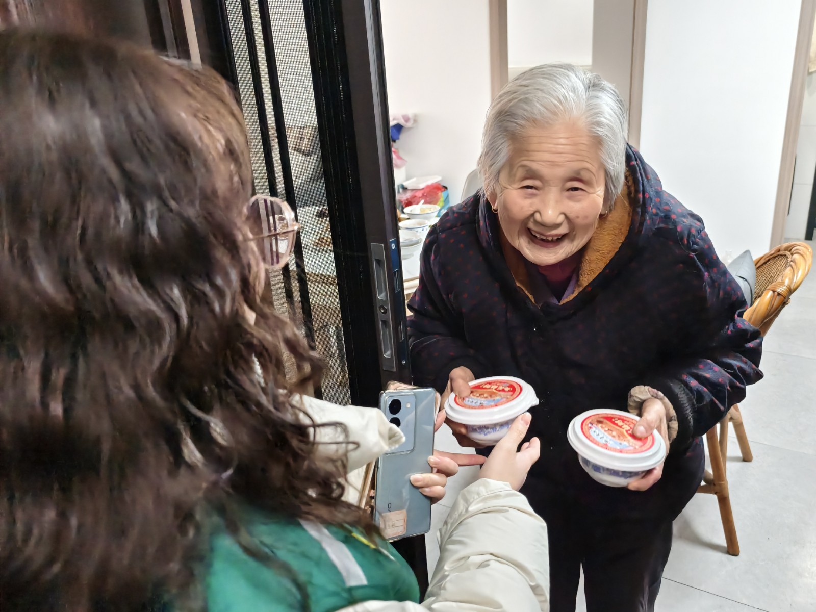 俗话说,“腊七腊八,冻掉下巴”,天气虽冷,不过居民们的热情却丝毫不减,在小区门口的发粥点,早上6点半活动正式开始,现场早早地开始排起了长队,很多居民闻讯专门前来喝上一碗热气腾腾的腊八粥,其中不乏打扮时髦的年轻男女和白发苍苍的老年人。尽管社区专门准备了一次性的碗和筷,仍有不少居民带者自家的保温盒,想要给家里老人孩子带口热粥。除了现场为居民发粥之外,社工们还分批次送到小区独居老人家中,让他们不出门就能感受这份社区情。