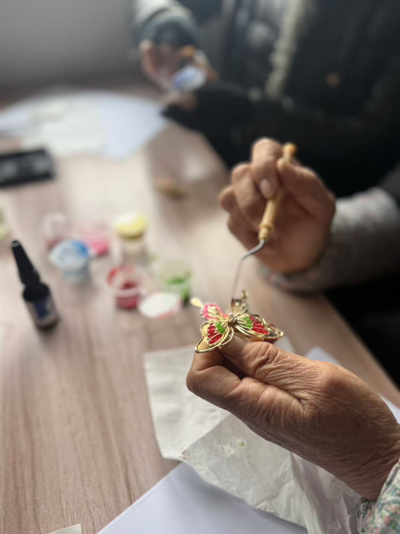 活动现场,老师详细讲解珐琅工艺的历史渊源、制作技巧与注意事项,通过图文并茂的展示,让居民们对这一传统技艺有了深刻认识。在随后的实践环节,大家充分发挥创造力,挑选心仪色彩的珐琅釉料,小心翼翼地填充在胸针模具中。调色、填色、烧制,每一步都凝聚着居民们的专注与用心。尽管过程中遇到些许挑战,但在老师的耐心指导和邻里间的相互帮助下,一枚枚精美的珐琅胸针逐渐成型。此次活动不仅让居民体验到手工制作的乐趣,还传承与弘扬了传统珐琅文化。