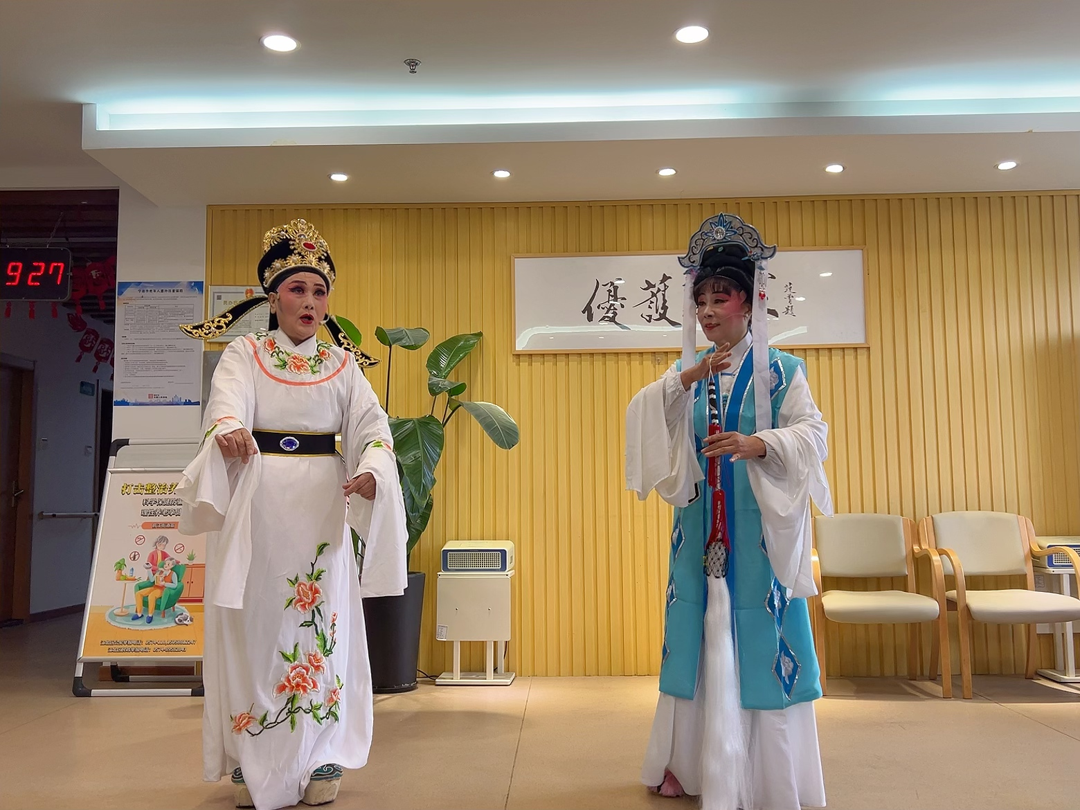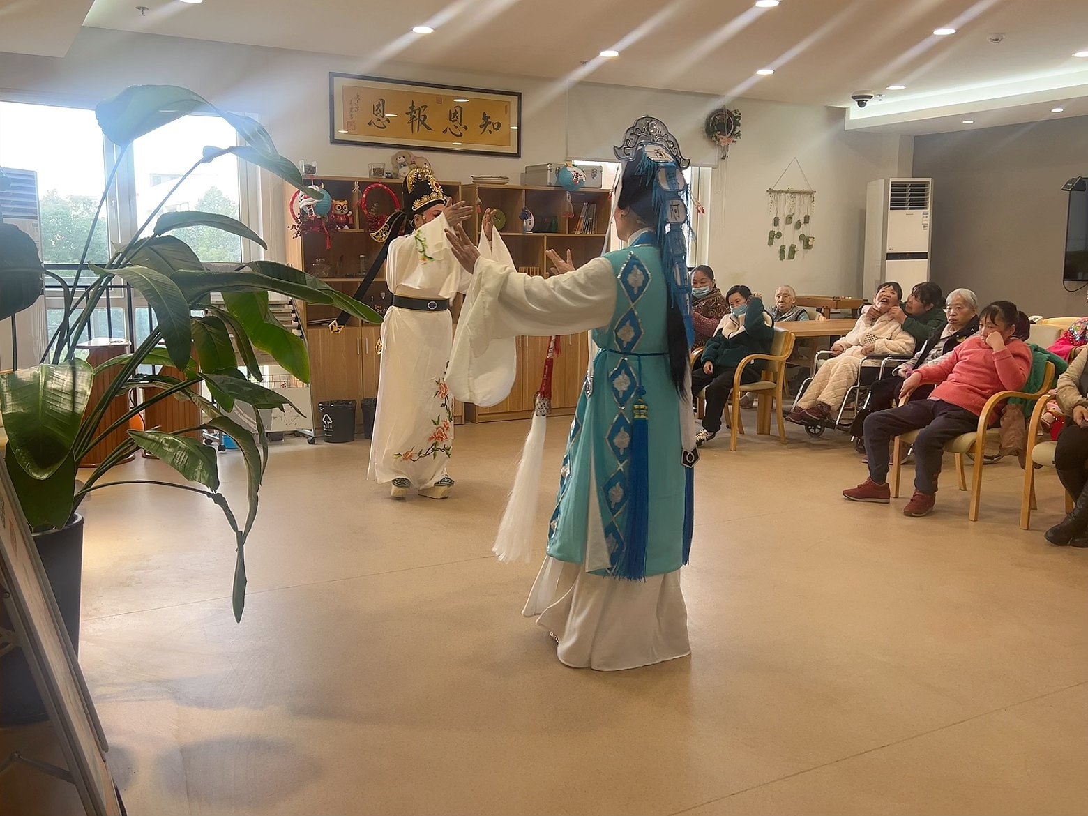 当日,居家养老中心摇身一变成为了戏曲的舞台世界。随着开场铜锣的清脆声响,演员们鱼贯而出,他们妆容精致、服饰华美,一颦一笑、一招一式皆韵味无穷。经典越剧《梁山伯与祝英台》选段,那缠绵悱恻的唱腔,仿佛带着观众穿越时空,走进了那段千古传颂的爱情传奇之中,台下的老戏迷们听得如痴如醉,眼眶不禁微微湿润,手中轻轻打着节拍,沉浸在戏曲的独特魅力海洋里。