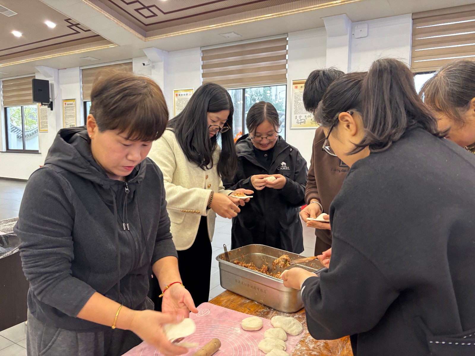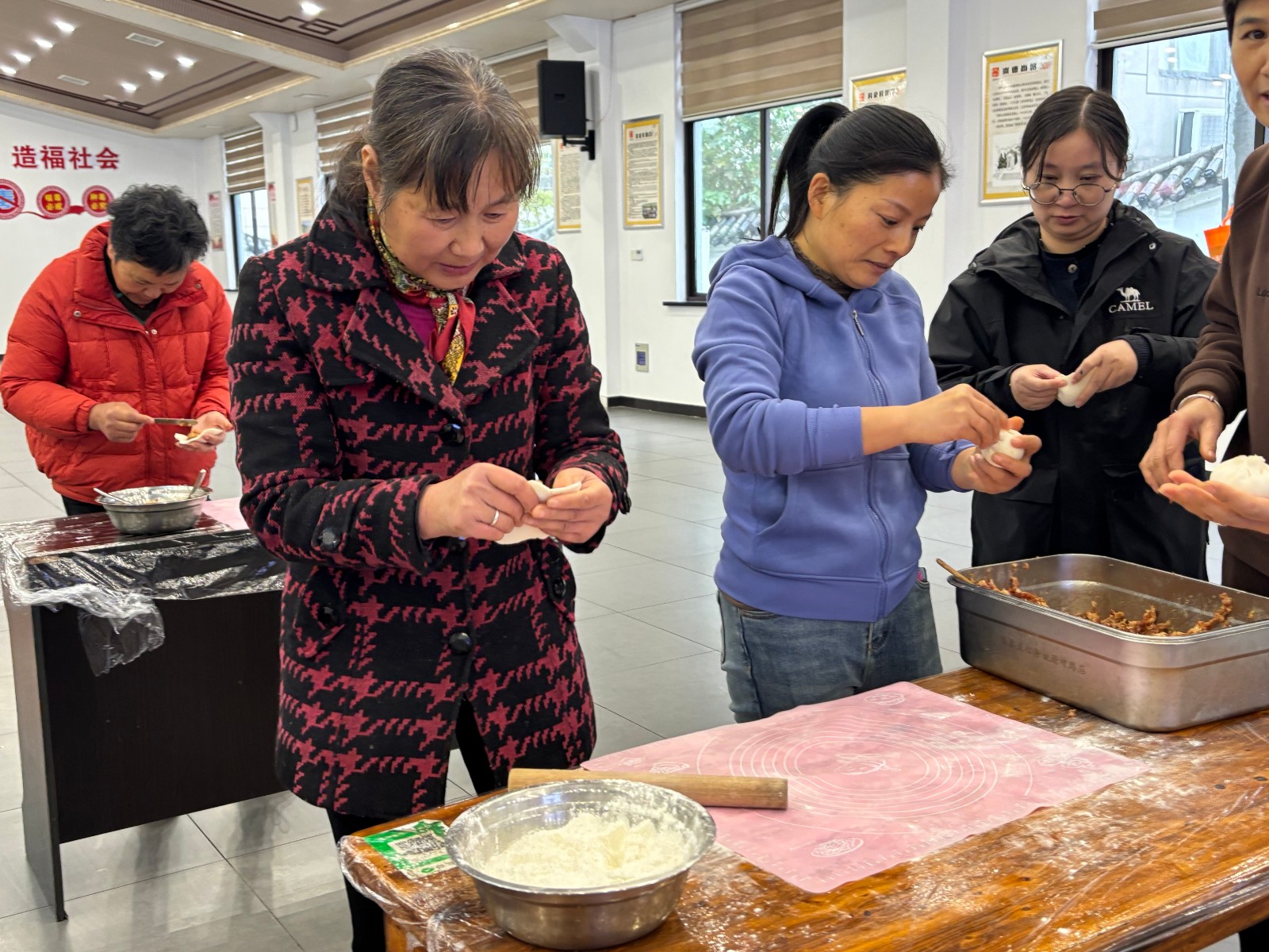 活动现场气氛热烈,参赛者们神采奕奕,大家纷纷拿出了自己的拿手绝活。梁弄大糕是余姚的非遗小吃,有着几百年的历史,是一种传统特色米制糕点。只见大家忙着将搅拌好的米粉,用筛子筛到大糕框里,再把大糕框里的粉细致地刮平,再雕空,加馅,在每一格框里加入豆沙馅,加完后,轻轻摇匀,最后盖粉,也是用筛子轻轻洒上一层面粉,盖住馅为止,刮平。整一个过程非常流畅。另一边大家围着在制作肉包子,拌馅的,擀包子皮的,捏合裹包子的……大家忙得不亦乐乎!