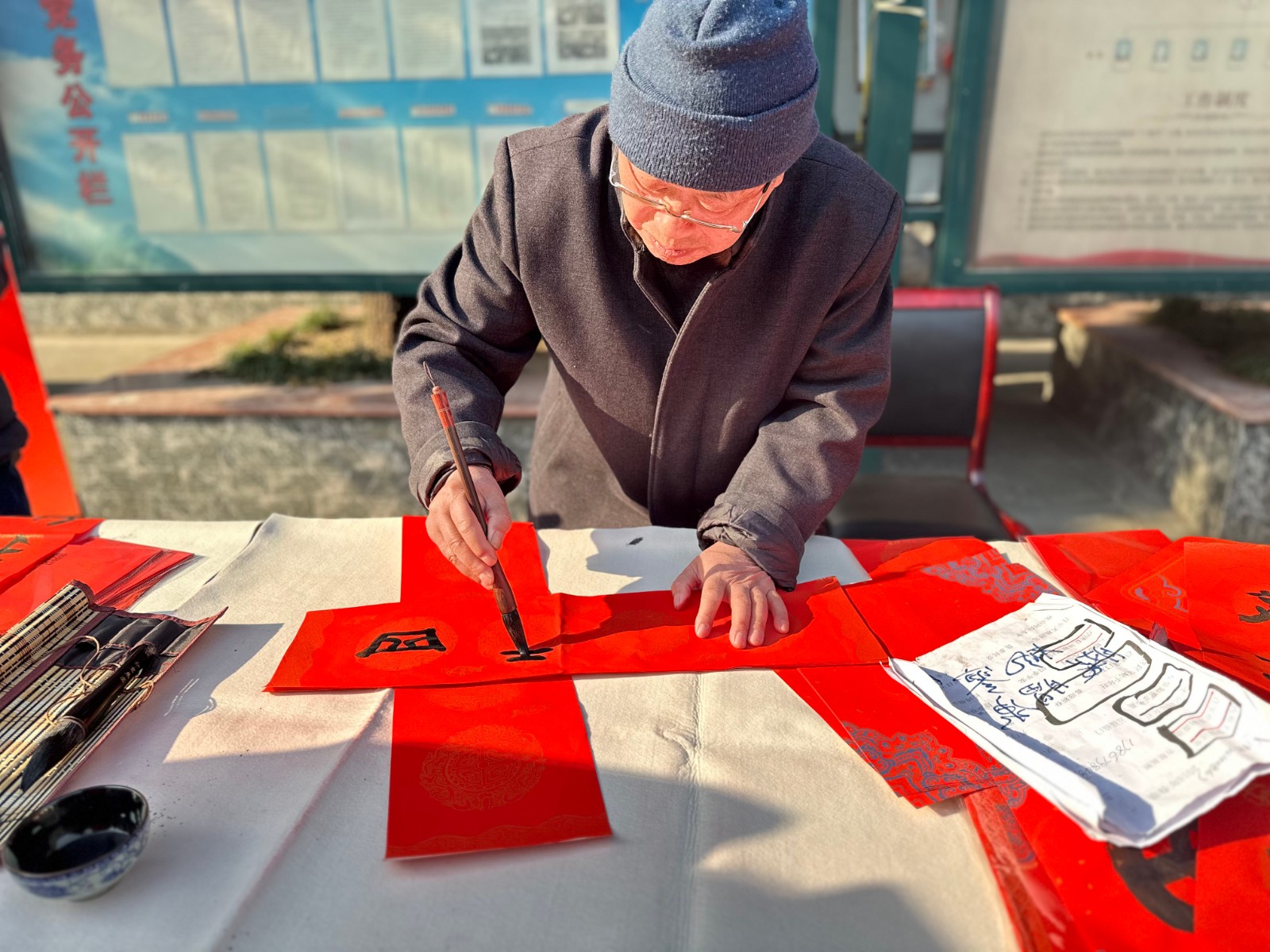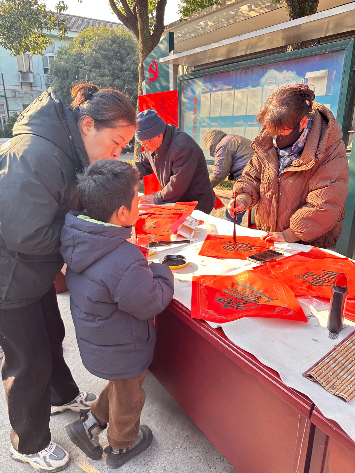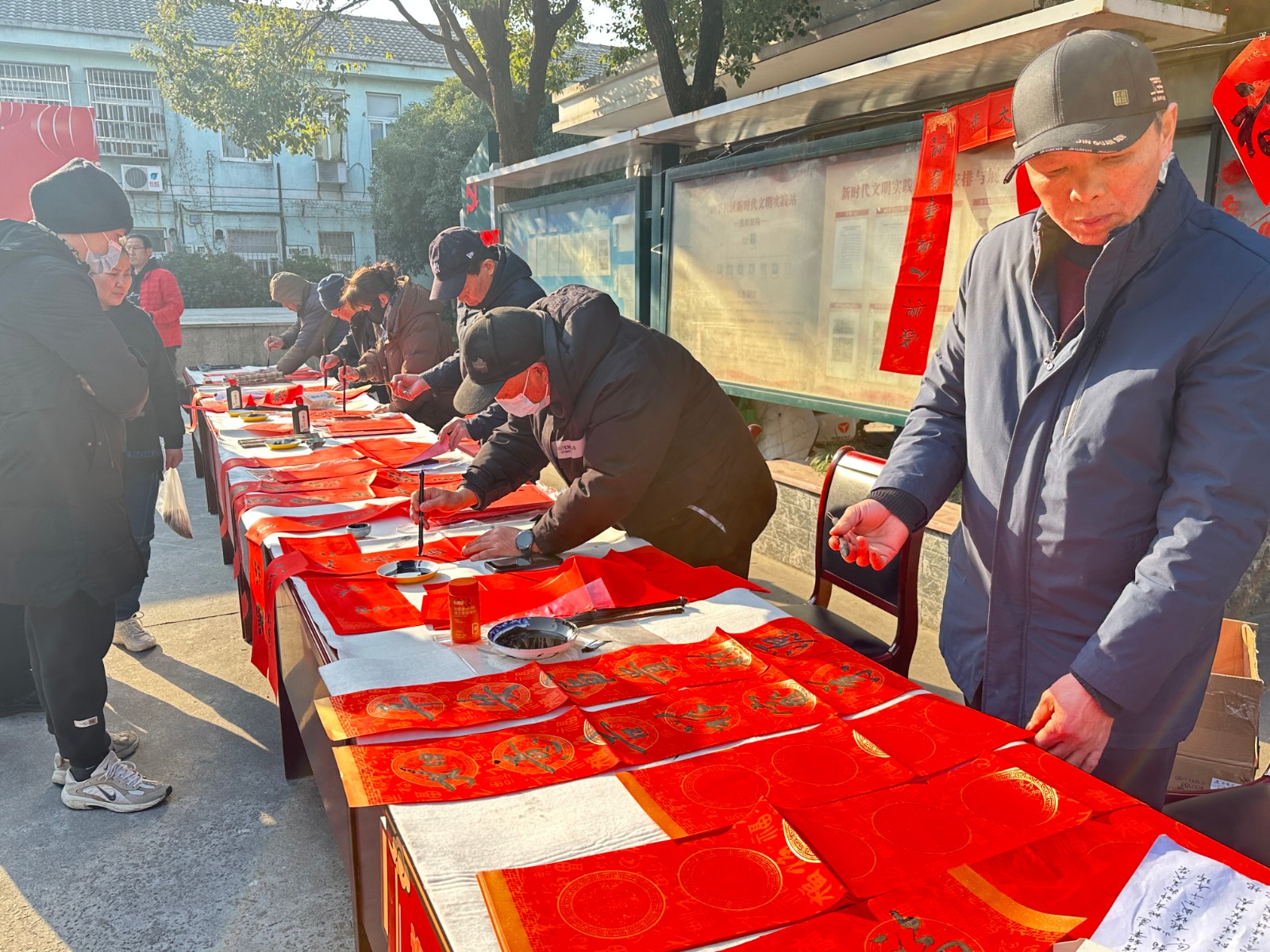 周围的居民们闻讯而来,纷纷围拢在桌旁,有的静静欣赏老师们的书法技艺,不时发出赞叹之声;有的则耐心等待着属于自己的那份春联和福字,脸上洋溢着幸福的笑容。一位大爷看着刚写好的“春临大地百花艳,节至人间万象新”的春联,高兴地说:“手写的春联就是有年味,比买的强多啦!感谢书画社的老师们啊!”