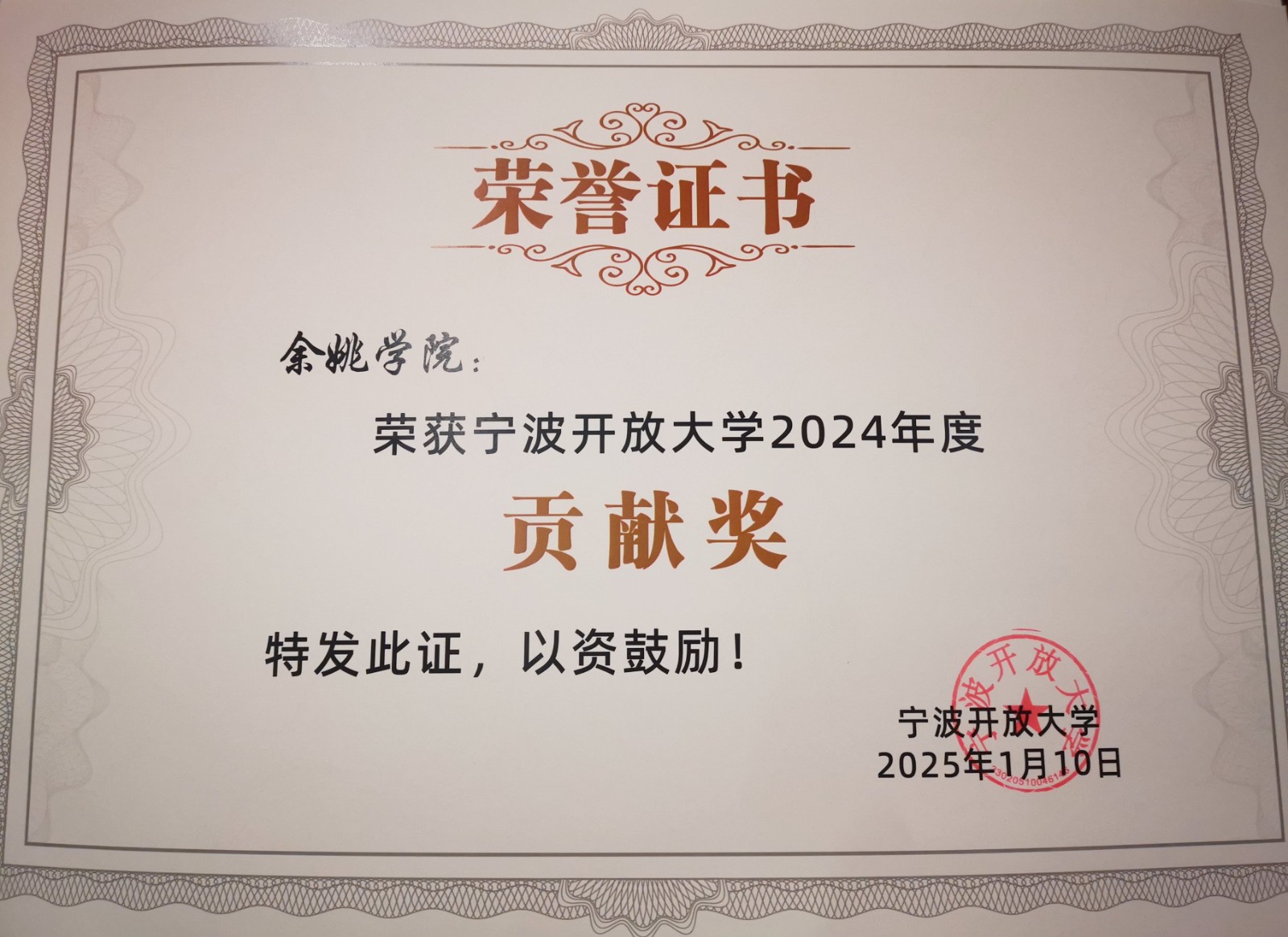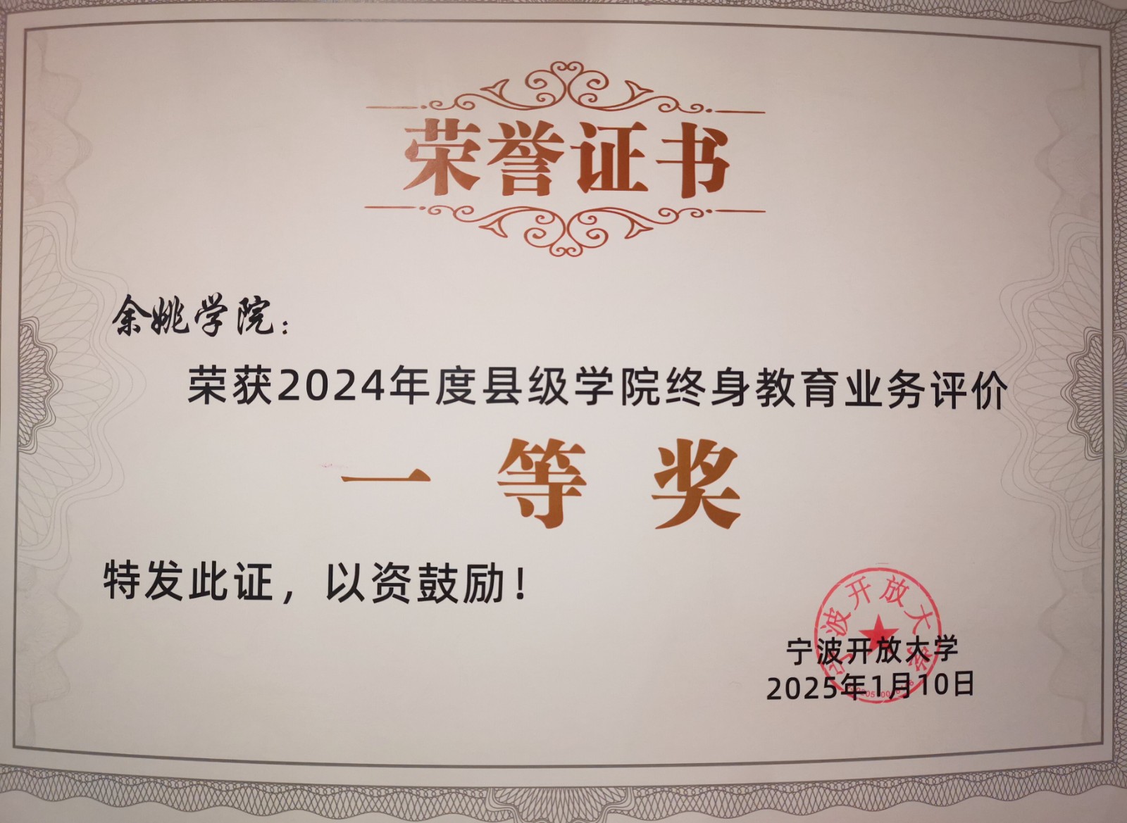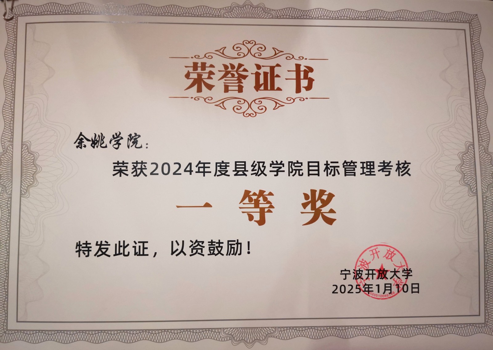 近日,宁波开放大学余姚学院在2024 年度宁波开放大学系统各项评选中脱颖而出,名列前茅,喜获佳绩县级学院目标管理考核一等奖、县级学院终身教育业务评价一等奖以及宁波开放大学贡献奖三大奖项揽入囊中,充分彰显了学院在终身教育服务全民学习、开放教育创优提质等工作中优异表现和突出贡献。