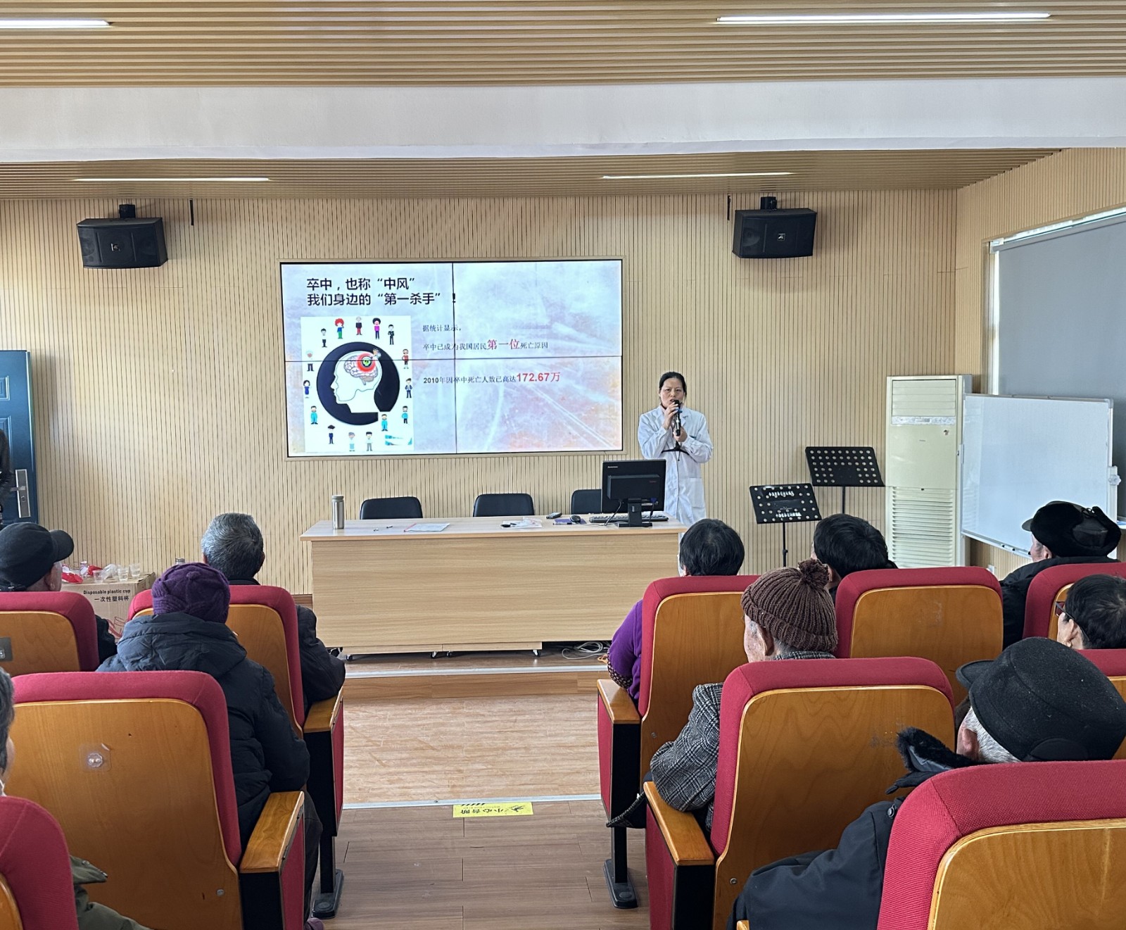 讲座现场,专业的医护人员通过大屏幕展示了丰富的图文资料,详细讲解了脑卒中(俗称“中风”)的相关知识,包括其发病原因、症状表现以及预防措施等。屏幕上醒目的数据显示,2019年中国卒中的发病人数高达472.67万,这一数字让在场的居民们深刻认识到了脑卒中的严重性和防治的紧迫性。