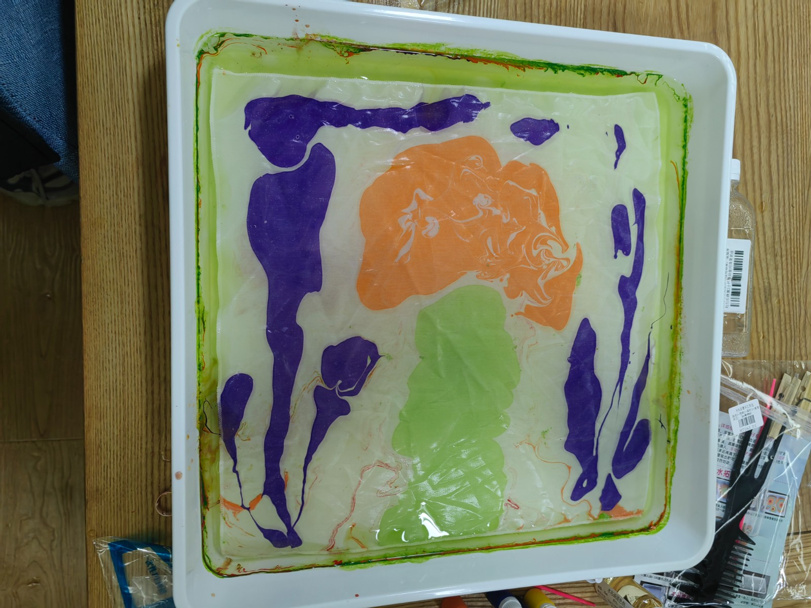 活动开始,志愿者老师先给大家讲解水拓丝巾的制作流程:首先,选择自己喜欢的颜色;然后,用一个颜色打底,密集地铺满整个画盘;轻轻地把颜料滴在水拓液上,注意挤压颜料时要轻,否则颜料容易沉到水底。接着,把其他颜色滴在水面上,颜色可以叠加四、用画针在画盘上画出喜欢的图案五、完成后把丝巾覆盖在图案上,浸入固色剂中,五到八分钟。最后,清水冲洗干净,拿起吹风吹干即可。
