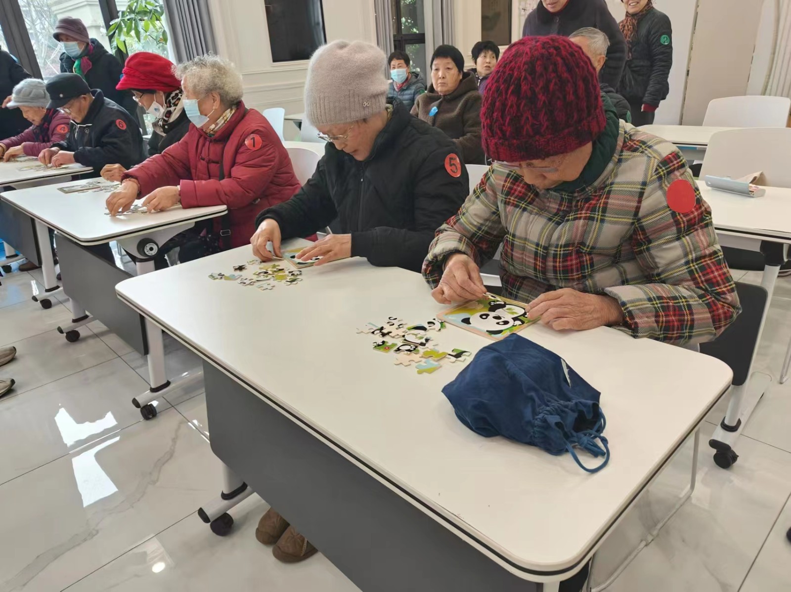 活动现场,老人们拿着凌乱的拼图,根据图形样本仔细比对,紧张而认真地拼着,遇到不会的地方,相互讨论,不一会儿,美丽的拼图成品呈现在眼前,老人沉浸在欢声笑语中。在轻松愉快的气氛中,大家体验到了拼图活动所带来的成就感。