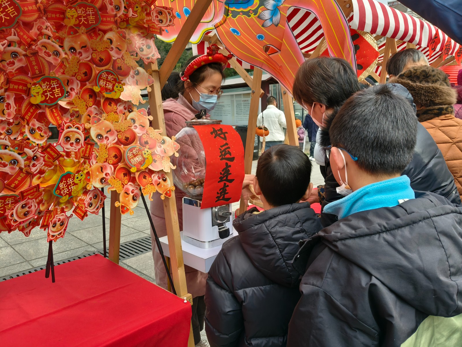 在文化送福区,居民们纷纷在“百福墙”前拍照打卡,墨香的对联、灵动的风车传递着满满的新春祝福。网格员们现场宣传防范电信诈骗、消防安全、垃圾分类等知识,助力居民度过一个平安、祥和的新年。