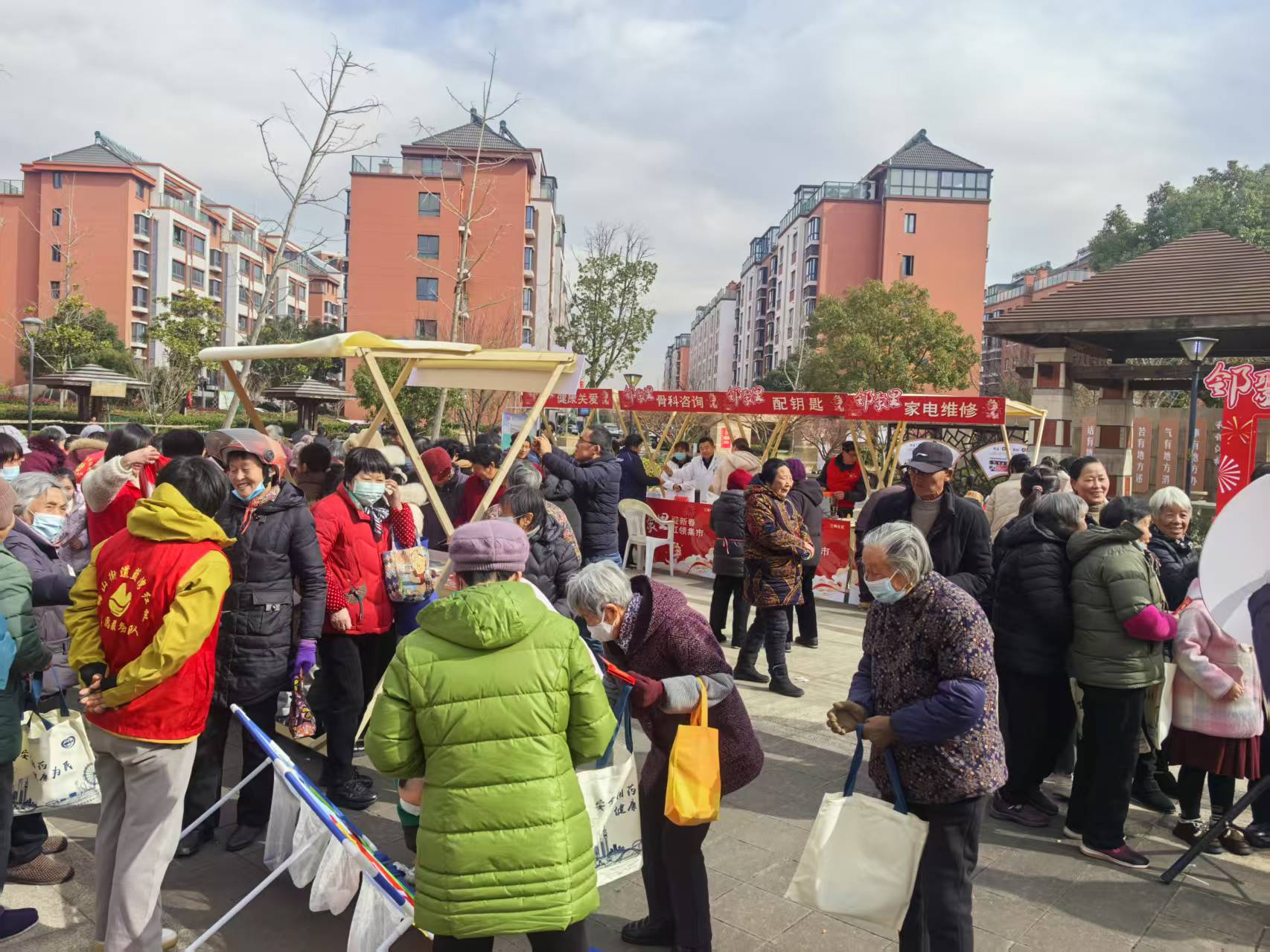 健康义诊摊位前,骨科医院的医疗团队为社区居民提供了测血压、血糖检测、健康咨询等服务,吸引了大量的居民。此外,新年拍张、反诈宣传、配钥匙、修家电、理发等摊位也各具特色,为居民们提供了全方位的服务。