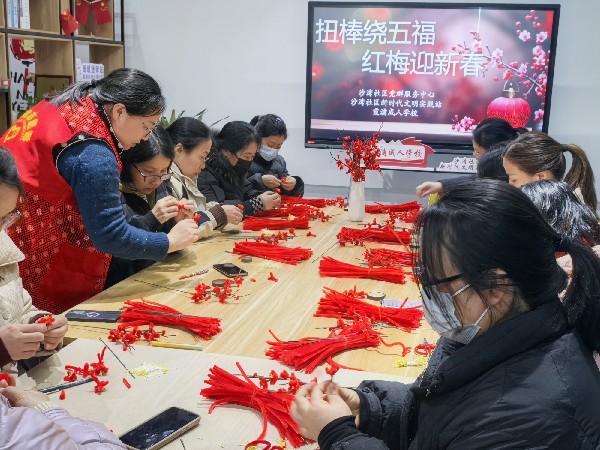 佳节将至,年味渐浓。为弘扬中华优秀传统文化,丰富居民群众精神文化生活,营造欢乐、祥和、温暖的节日氛围,近日,沙湾社区联合霞浦成人学校在居民会客厅开展“扭棒绕五福 红梅迎新春”扭扭棒制作活动,以红梅为媒,以扭棒为介,让来自辖区的青年们在巧手生花中感受传统节日的独特魅力,在邻里间的互动中促进文化的交融。