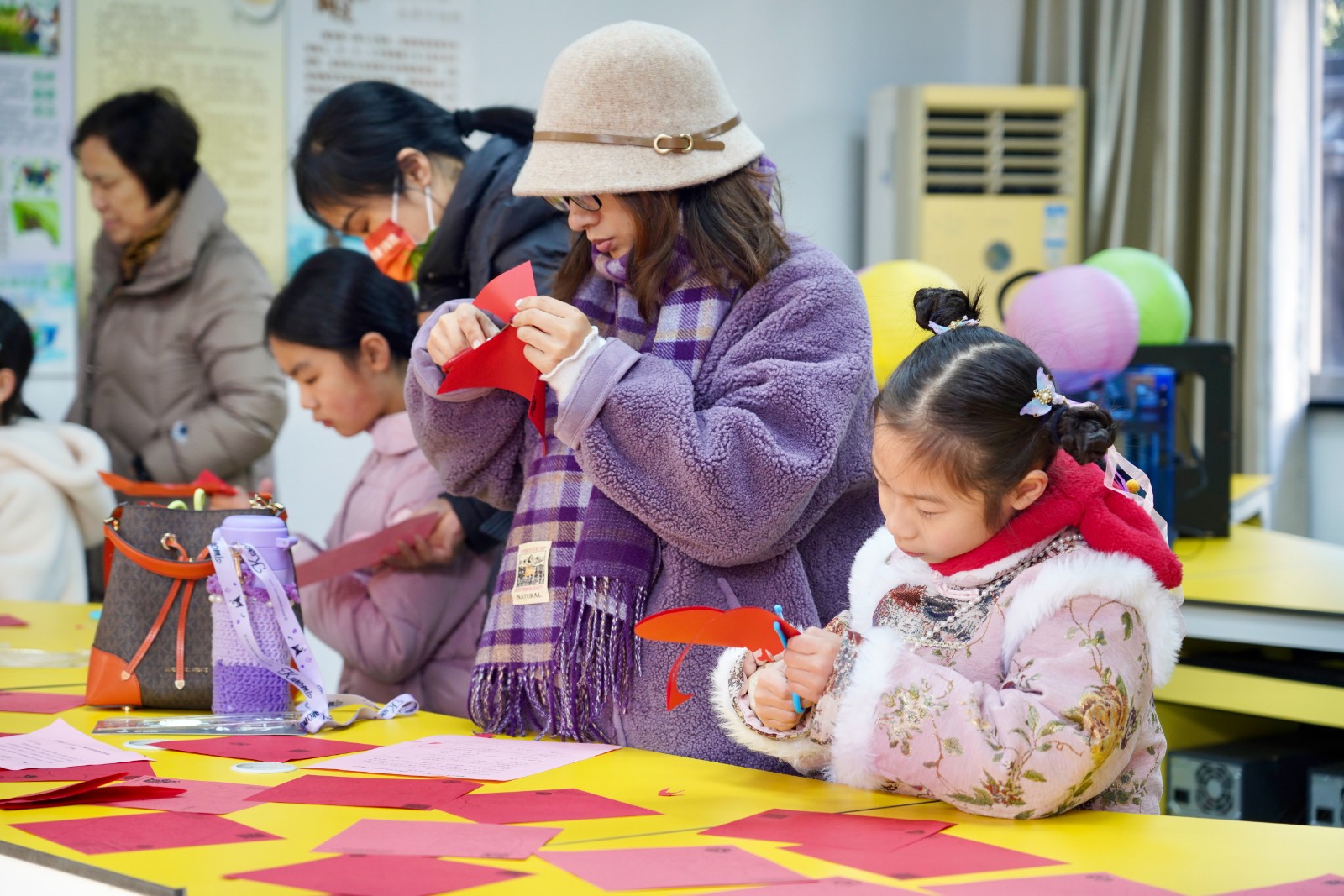 在剪窗花区域,长桌宛如一座艺术展台,摆满了琳琅满目的剪纸样本。小朋友们的眼睛里闪烁着兴奋的光芒,仔细挑选着心仪的花样。不一会儿,形态各异的剪纸作品便在他们与长辈的巧手下诞生了。有憨态可掬的小猴,有威风凛凛的老虎,还有精巧对称的雪花、古朴典雅的高塔。有的小朋友沉浸其中,剪了一个又一个;有的起初面对复杂的图案面露难色,剪到一半打起了退堂鼓,在家长的鼓励下,最终成功完成作品;就连长辈们也被这热烈的氛围感染,兴致勃勃地拿起剪刀,与孩子一同沉浸在剪纸的乐趣之中 。