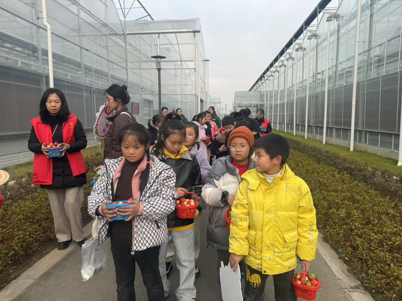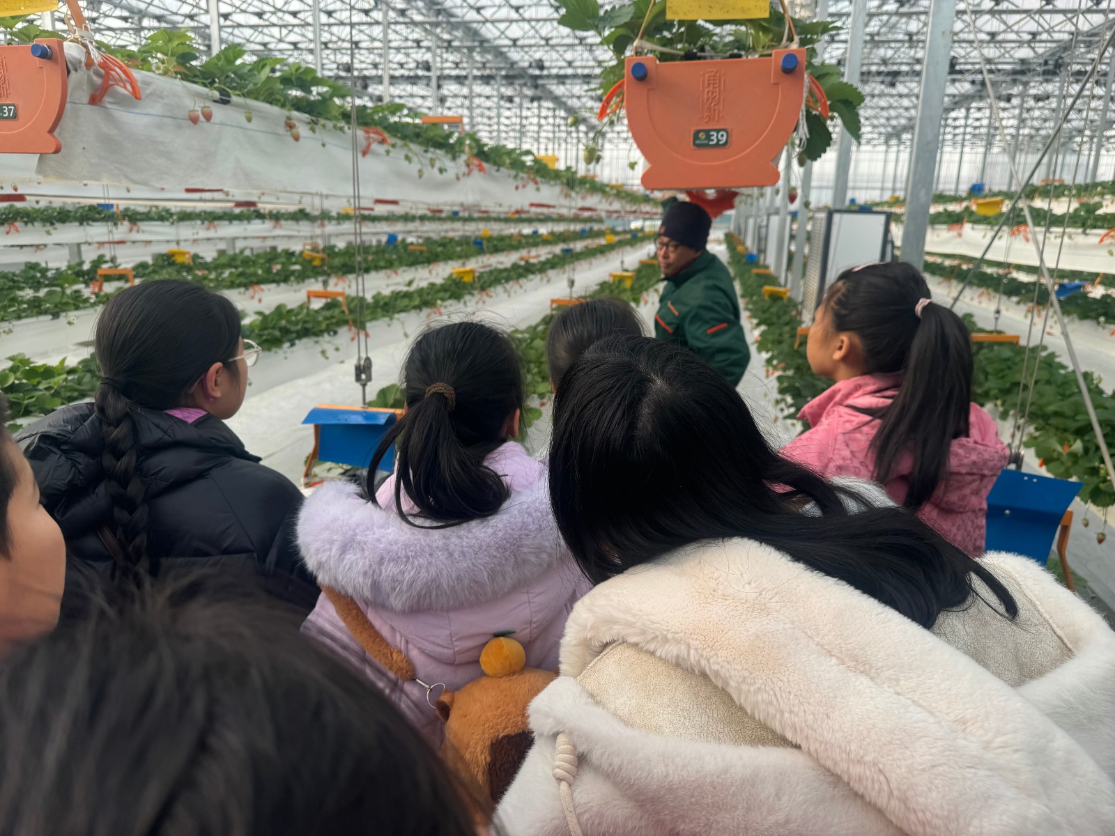 随后,一行人前往时新生态农场,走进现代化草莓种植大棚,一股清新的果香扑鼻而来,让人瞬间陶醉。孩子们在基地老师和“五老”志愿者的引导下,兴奋地穿梭于绿意盎然的草莓行间,亲手采摘着一颗颗红彤彤的大草莓。他们小心翼翼地捧着自己的“战利品”,脸上洋溢着满足与喜悦的笑容,兴奋地与伙伴们分享着采摘的乐趣和成果。