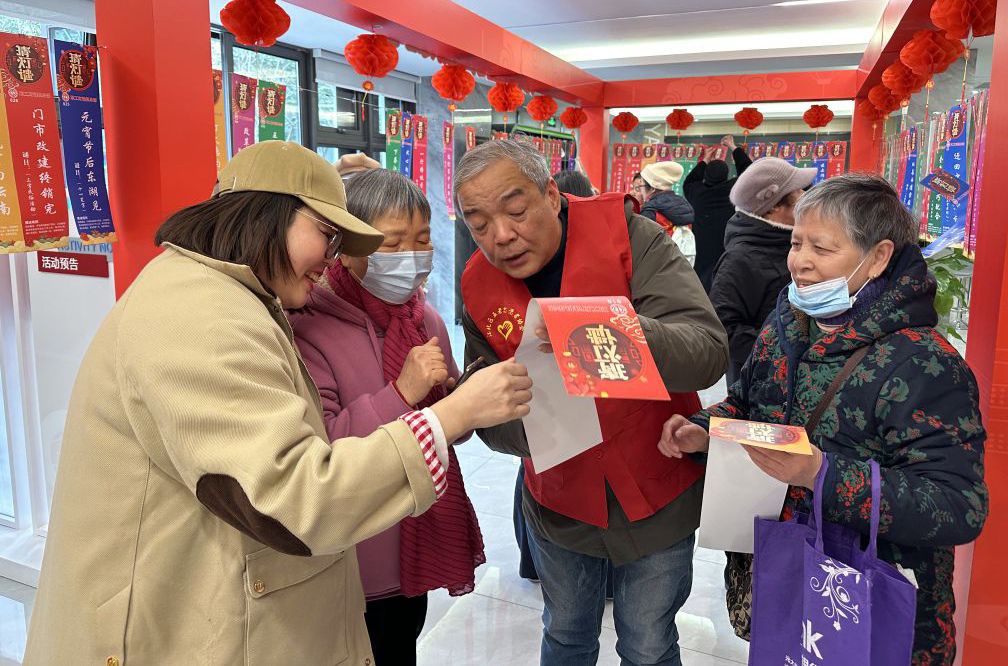 活动中,社区大厅被装饰的喜气洋洋,红色的灯笼挂满整个社区。在猜灯谜区域,灯笼上附着一条条写有灯谜的纸条,内容包含传统民俗、诗词、成语以及垃圾分类、反诈科普等多种类别,大家猜谜,猜出正确谜底即可领取小礼品,既考验了居民们的智慧,又增添了节日的趣味性。