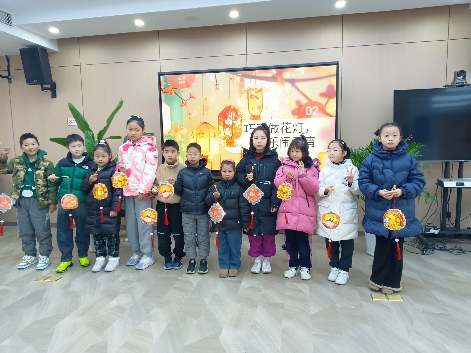 经过一个多小时的努力,一盏盏造型各异、色彩缤纷的手提灯笼逐渐成形。有的灯笼上绘有精美的图案,有的则装饰着闪闪发光的彩带,每一盏灯笼都承载着孩子们的创意和祝福。孩子们提着自己亲手制作的灯笼,脸上洋溢着自豪和喜悦的笑容,纷纷合影留念,记录下这难忘的时刻。