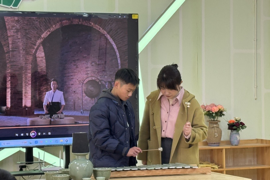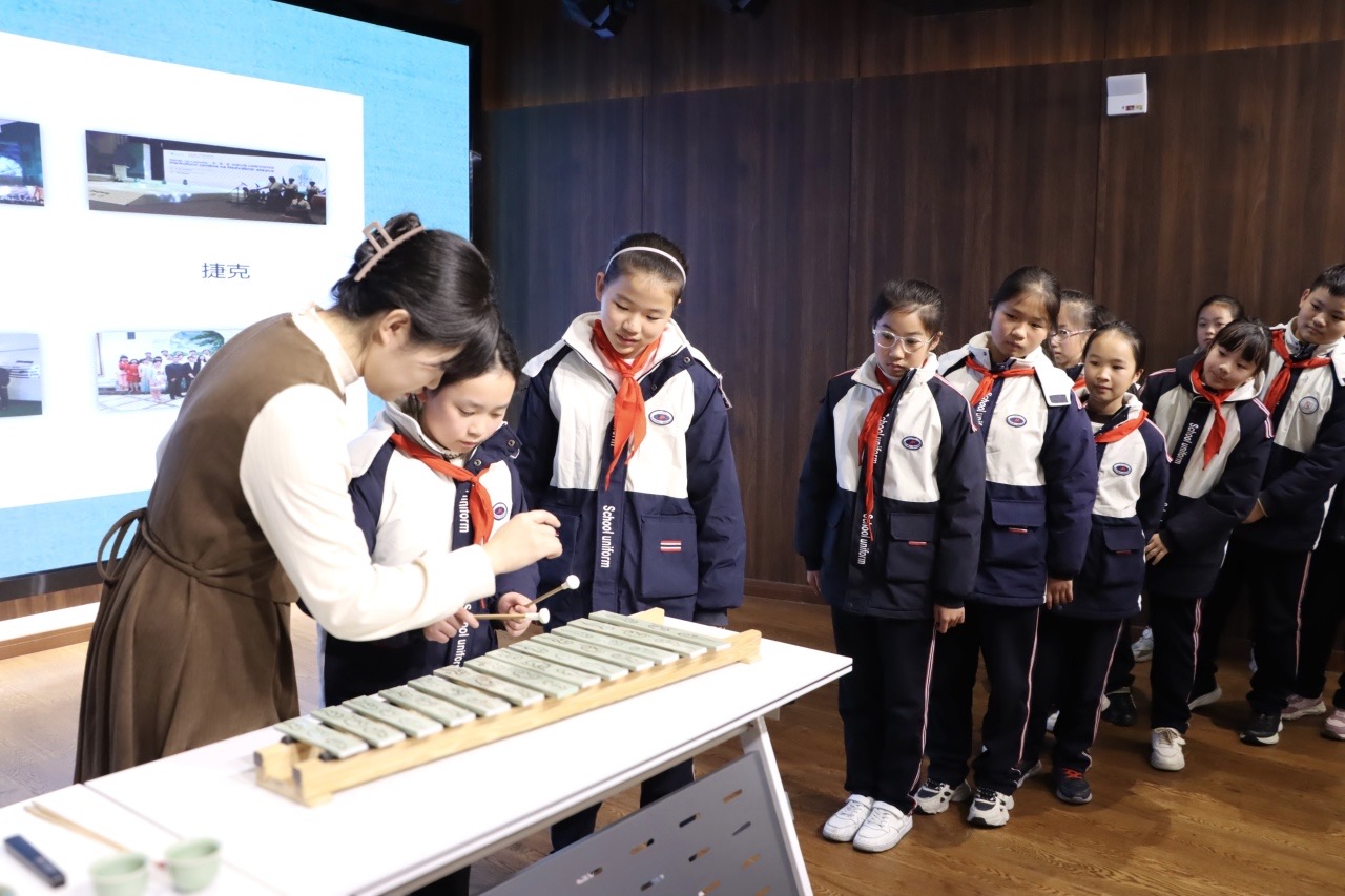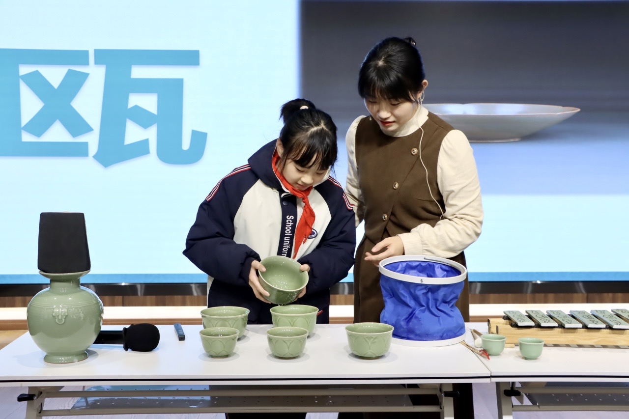 青瓷瓯乐凭借其深厚的历史文化底蕴及独特典雅的艺术风格,深受国内外观众的喜爱与赞赏,充分凸显了民族文化魁宝的无限魅力。白中华老师将瓷碗、瓷沙锤、瓷花瓶、瓷片琴等乐器搬到现场,通过展示实物、图文并茂的方式,围绕青瓷瓯乐的历史起源、传承现状、曲目创作等方面为青少年们介绍了越窑青瓷瓯乐。随后,她引导大家体验了乐器演奏。通过亲手敲击出清脆悦耳的旋律,孩子们感受到了非遗文化的神奇和魅力。