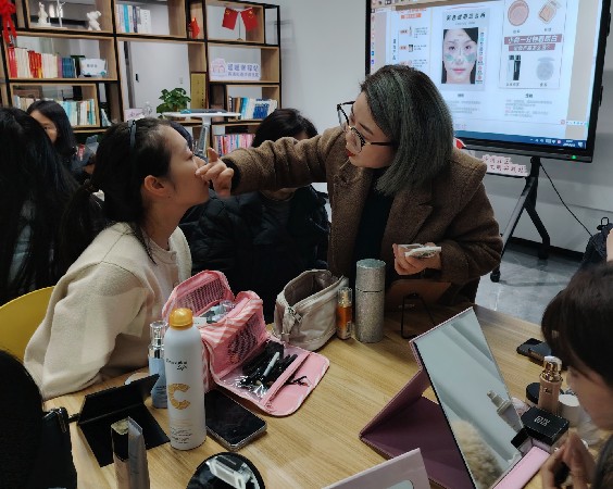 此次活动特别邀请了资深专业化妆师史老师,为学员们深入浅出地讲解基础护肤知识,并详细阐述了如何根据不同脸型设计个性化妆容的方法。这一教学环节,让学员们不仅了解了护肤与化妆之间的密切关系,而且为后续学习彩妆技巧奠定了坚实的基础。在教学过程中,学员们聚精会神,一边认真聆听史老师的讲解,一边详细记录关键知识点,不少学员还拿出手机拍摄重要步骤。在实践环节,模特配合老师进行化妆演示,让学员直观地感受到化妆带来的变化,激发了他们对美的热爱和追求。为了增强学习效果,课程特别设置了互动实操环节。学员们积极参与,亲自上手实践,化妆师则在旁边一对一地进行细致指导,确保每个学员的操作都正确无误。无论是眼线勾勒的技巧,还是唇妆的搭配,学员们都在实践中获得满满的知识,深刻体会到了化妆的乐趣和魅力。