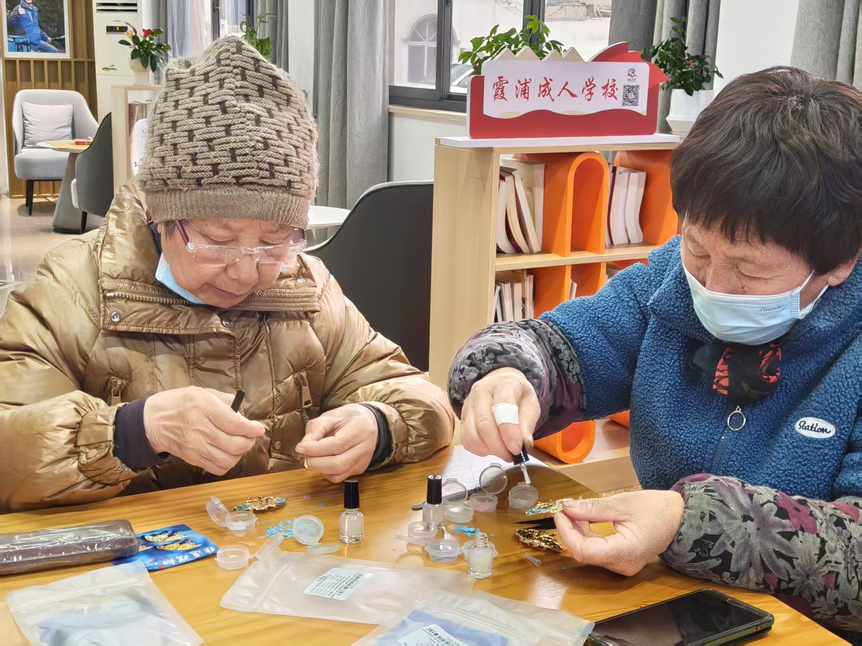 近日,霞浦成校与新浦社区携手开展了螺钿胸针制作培训和彩绘石膏香薰DIY。二个活动50多位老年居民参加。