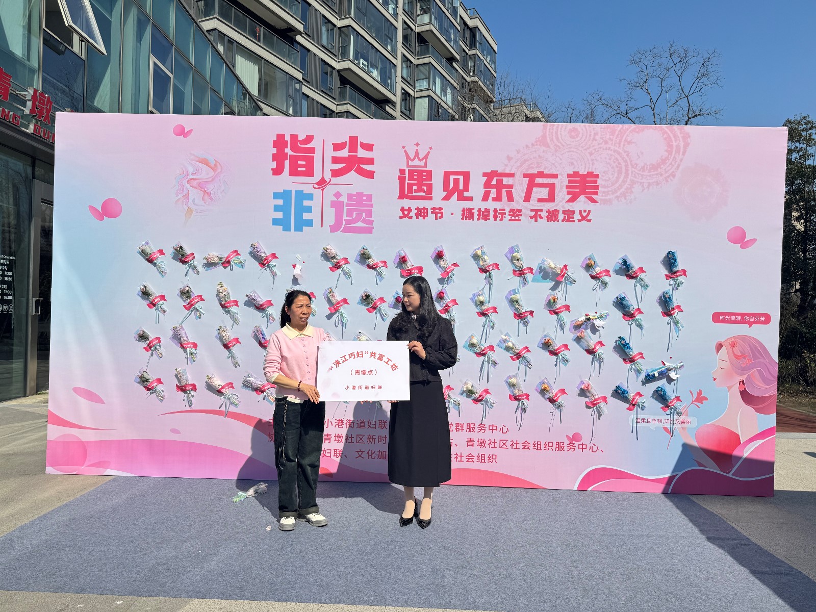 活动在小港街道妇联蒋丽萍主席的温情致辞中拉开帷幕。主席向全体女性致以节日问候,强调妇联将持续深化权益保障、创业支持及家风建设服务,并现场为浃江巧妇共富工坊·青墩点授牌,以非遗手作产业赋能女性灵活就业,激发巾帼力量。