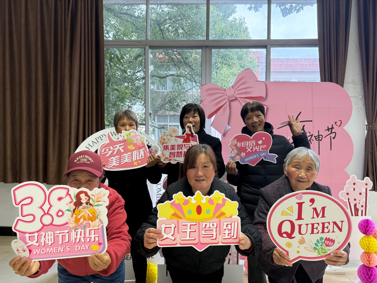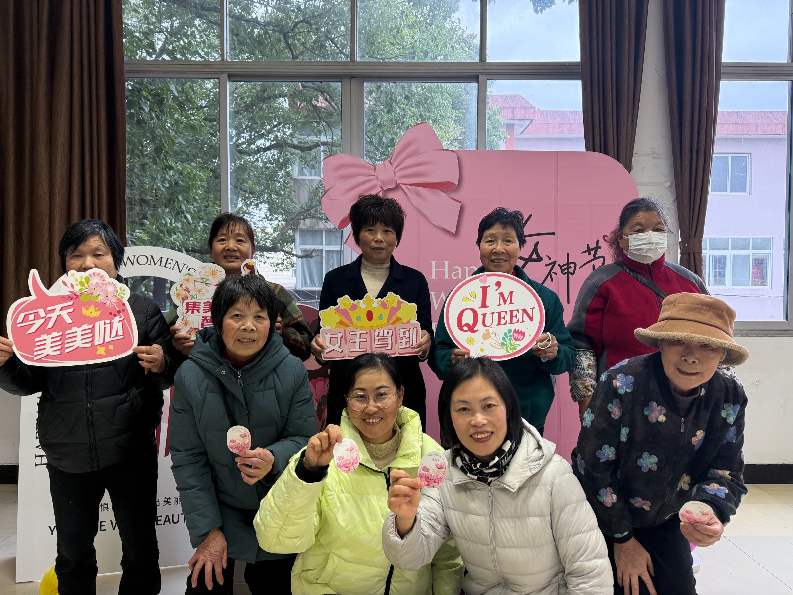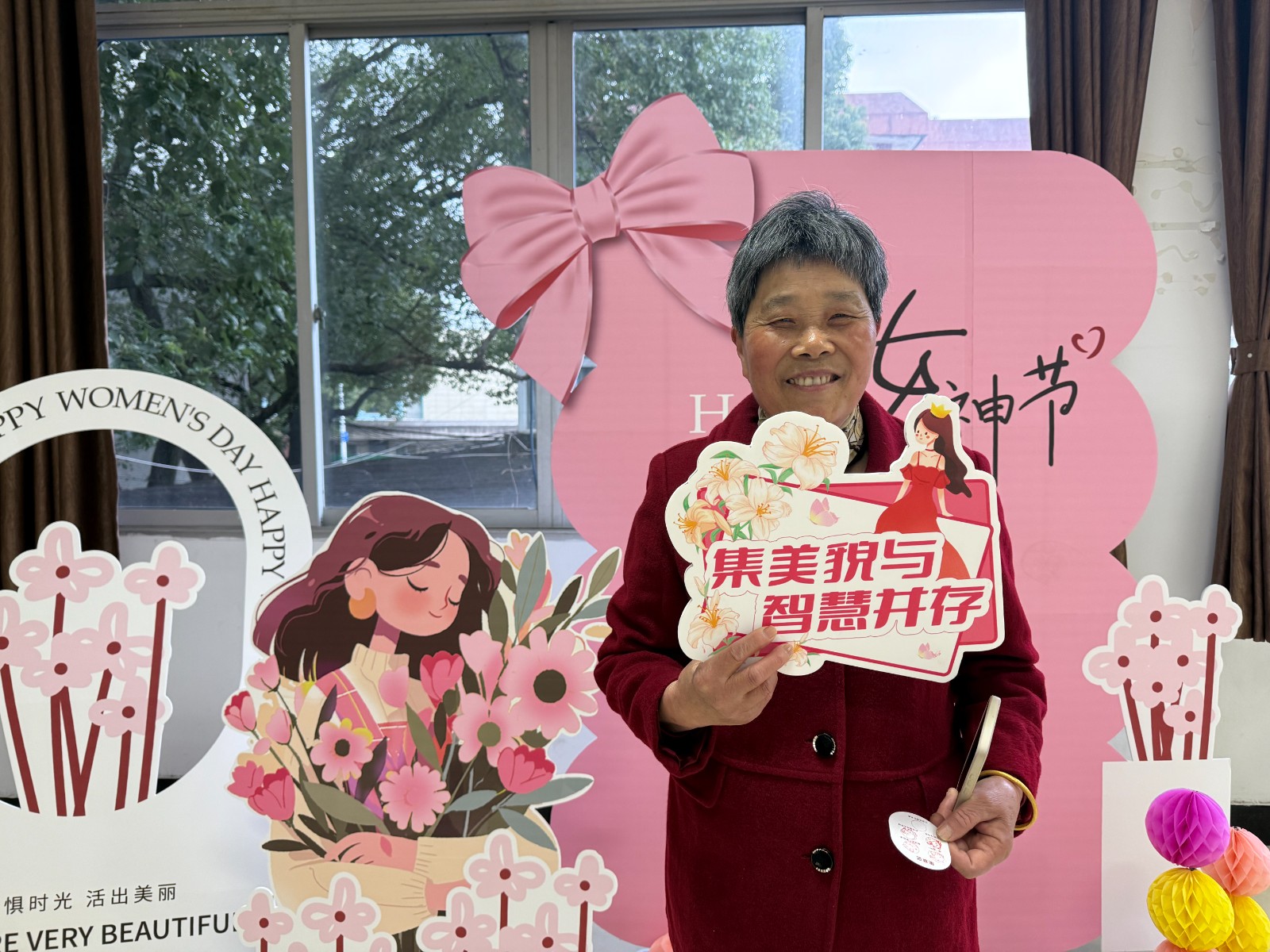 活动现场最亮眼的莫过于“花漾女神”主题打卡区。装饰的粉色背景墙前,居民们手持“集美貌与智慧并存、今天美美哒”等创意手举牌合影,社区摄影志愿者为每位参与者拍摄专属纪念照。“这张要发朋友圈好好纪念”,刚退休的陈阿姨对着手机里的成片笑得合不拢嘴。