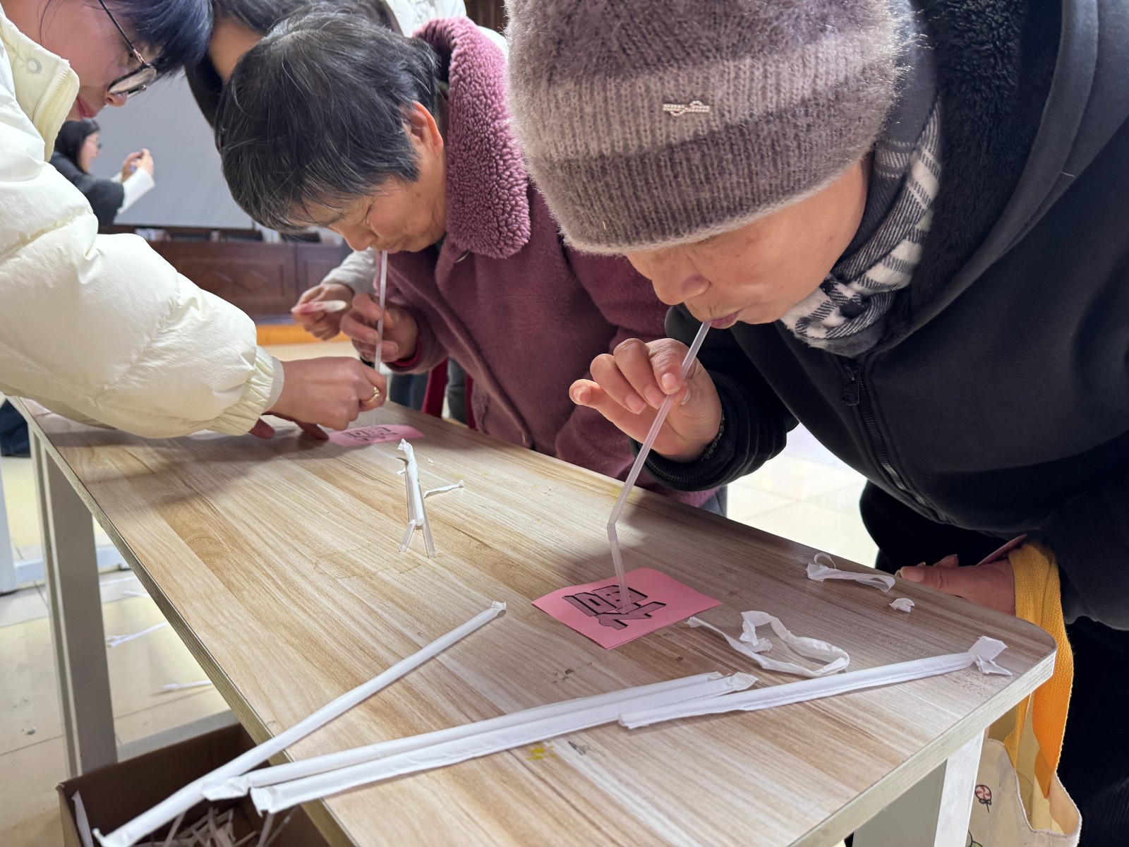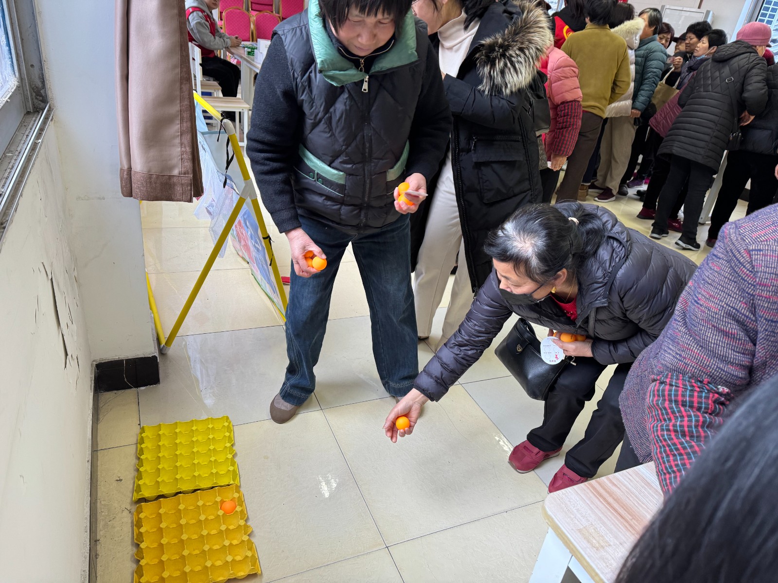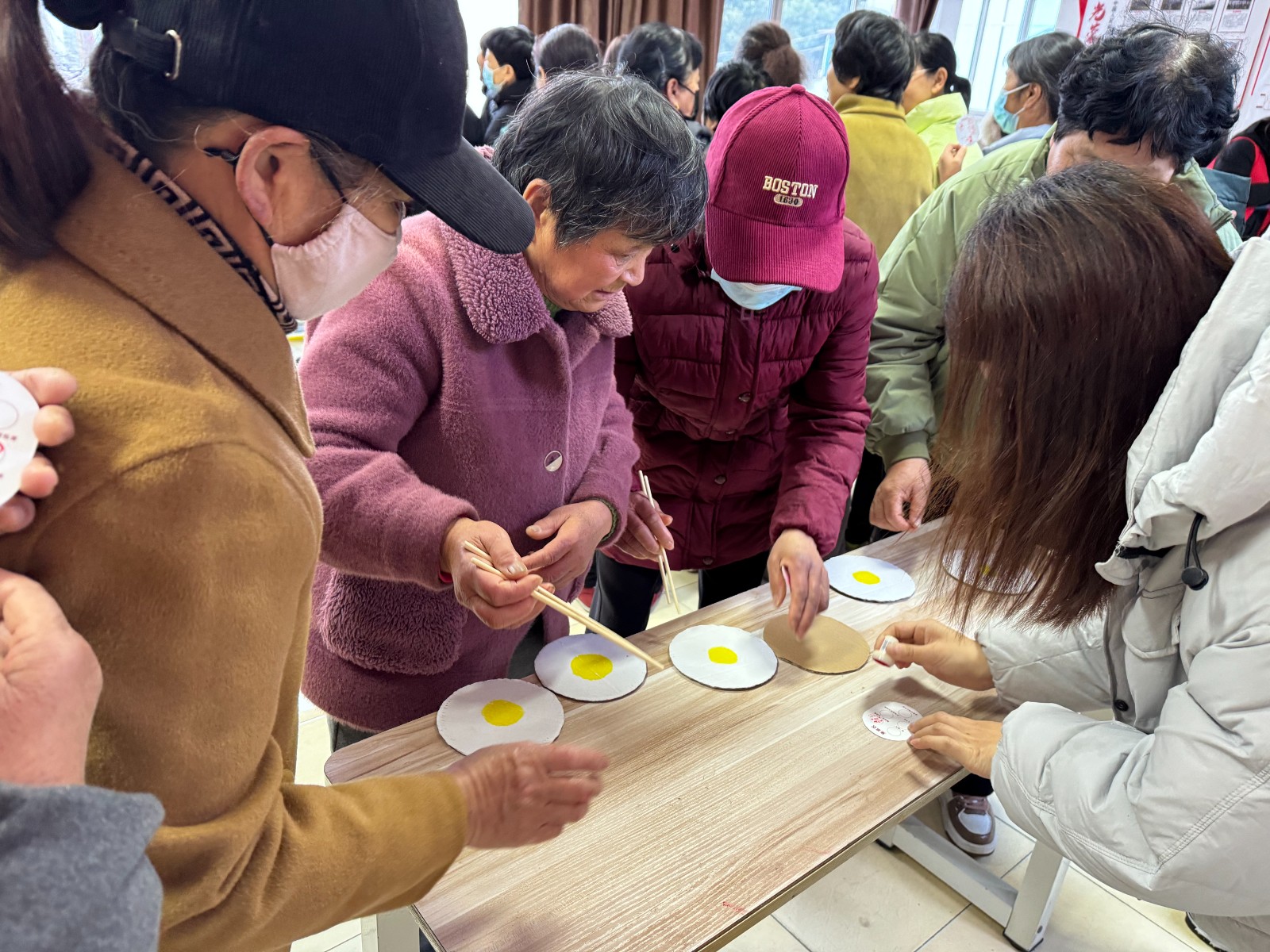 下午2时,社区实践站内已洋溢着欢声笑语。社区网格员身穿志愿者衣服热情迎宾,“请您先体验’吸福气’游戏,讨个好彩头!”。在志愿者的引导下,居民李女士用吸管娴熟传递着轻薄的福气纸片,20秒内顺利完成挑战,赢得首枚通关印章。隔壁“翻滚吧荷包蛋”区域,阿姨们正专注地用筷子为道具将荷包蛋翻面,“这个要讲究手腕巧劲,和我平时煎鸡蛋一个道理”,侨属江阿姨边操作边向围观群众传授心得。