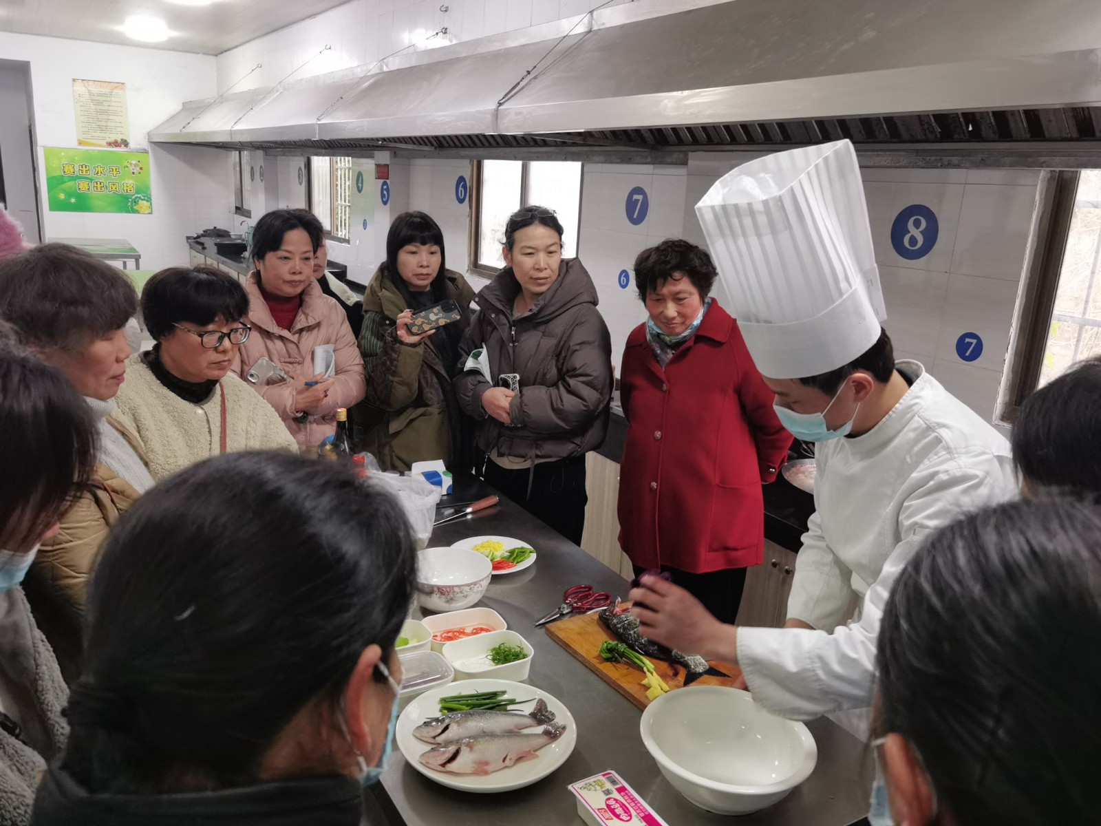 当天的课程特别邀请了经验丰富的月嫂王珍飞阿姨担任主讲。王阿姨从事月嫂工作多年,是海田阿姨工作室负责人,她结合自身丰富的实战经验,深入浅出地分享了月子期间的饮食禁忌、营养搭配等实用知识。为了让学员们更直观地学习,课程还特别邀请了中式烹饪二级技师现场演示了三道经典月子餐:河鲫鱼豆腐汤、清蒸鲈鱼和麻油猪肝。烹饪过程中,老师一边操作一边讲解,详细介绍了每道菜品的制作技巧和营养要点。现场学员们认真听讲,不少人还做了详细的笔记。