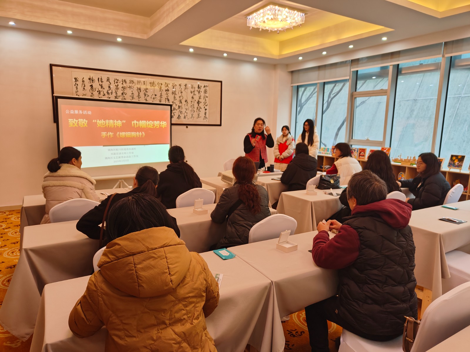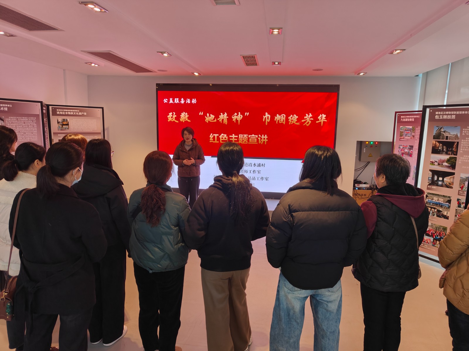 随后,纪念馆宣讲员刘盈老师以《如霞红枫》为题,为大家作红色主题宣讲、宣传内容有关革命女性在历史洪流中的坚韧与奉献。镇海区文艺新秀俞晶晶老师则通过歌曲《时刻惦念着你》,深情讴歌了女性在家庭与社会中的无私付出。两位老师的宣讲和歌声感人至深,令在场女性深受鼓舞。