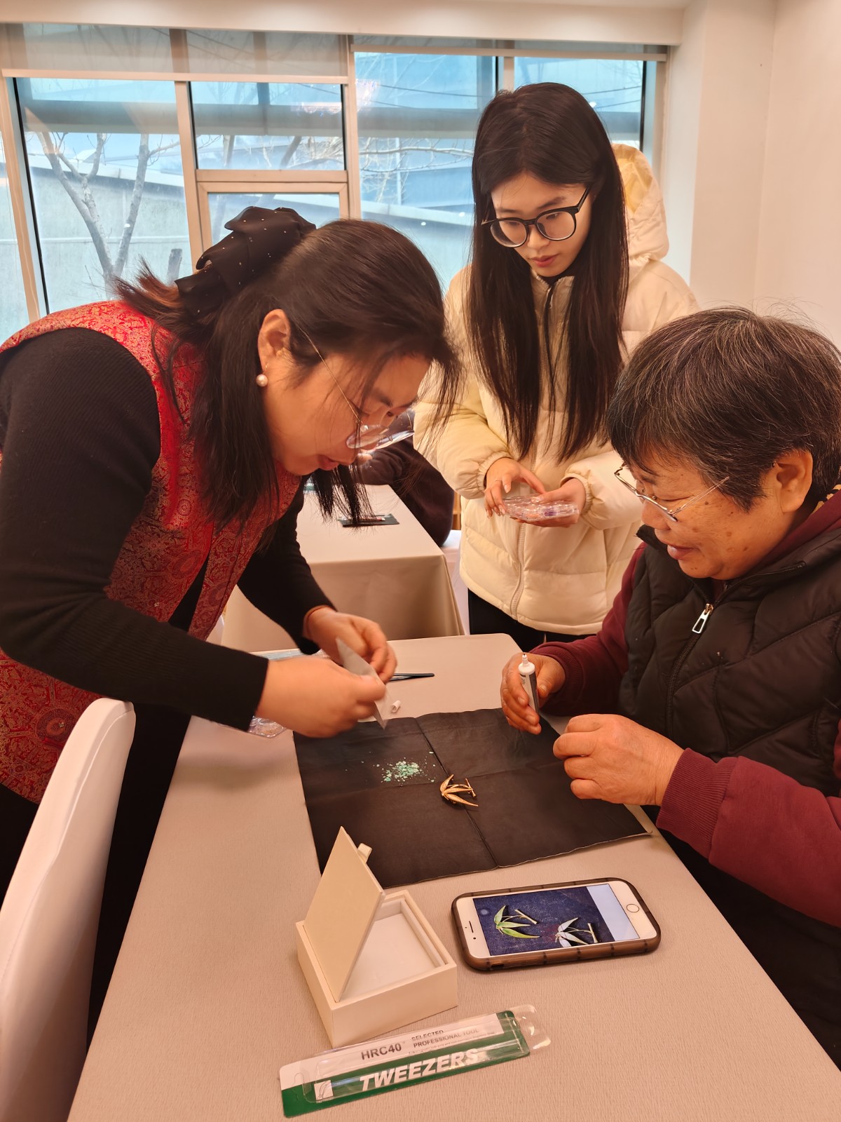 活动的压轴环节是沉浸式手作体验。在王珍老师的指导下,大家充分发挥创意,将螺钿片、首饰胶水、亮油等材料巧妙组合,制作出独具匠心的胸针作品。每一枚胸针都凝聚了女性的智慧与巧思,展现了新时代女性的独特魅力。