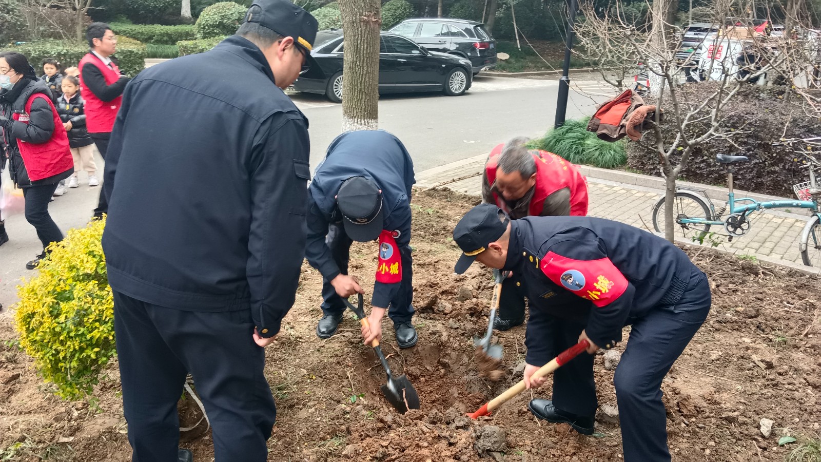 活动现场,那可真是一片热火朝天、繁忙却又秩序井然的欢乐景象。庄市街道综合行政执法队的队员们展现出了严谨认真的态度。他们熟练地挥锹挖坑,那动作一气呵成,一看就是经验丰富。挖好坑后,小心翼翼地将树苗扶起,确保树苗直直地站立在坑中,然后再一锹一锹地培土,最后用脚把土踩实,每一步都做得一丝不苟,不放过任何一个细节,仿佛在完成一项神圣而伟大的使命。
