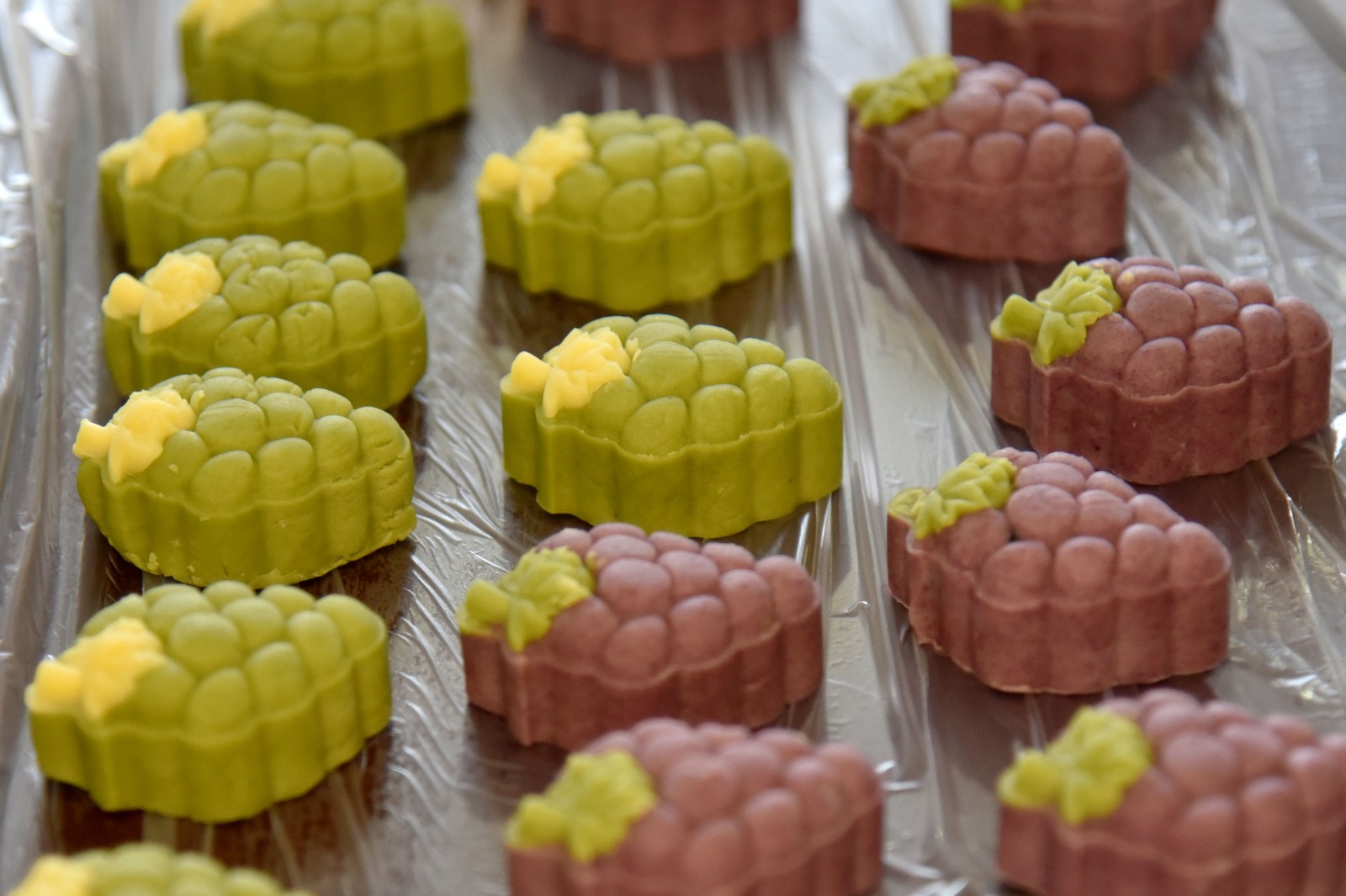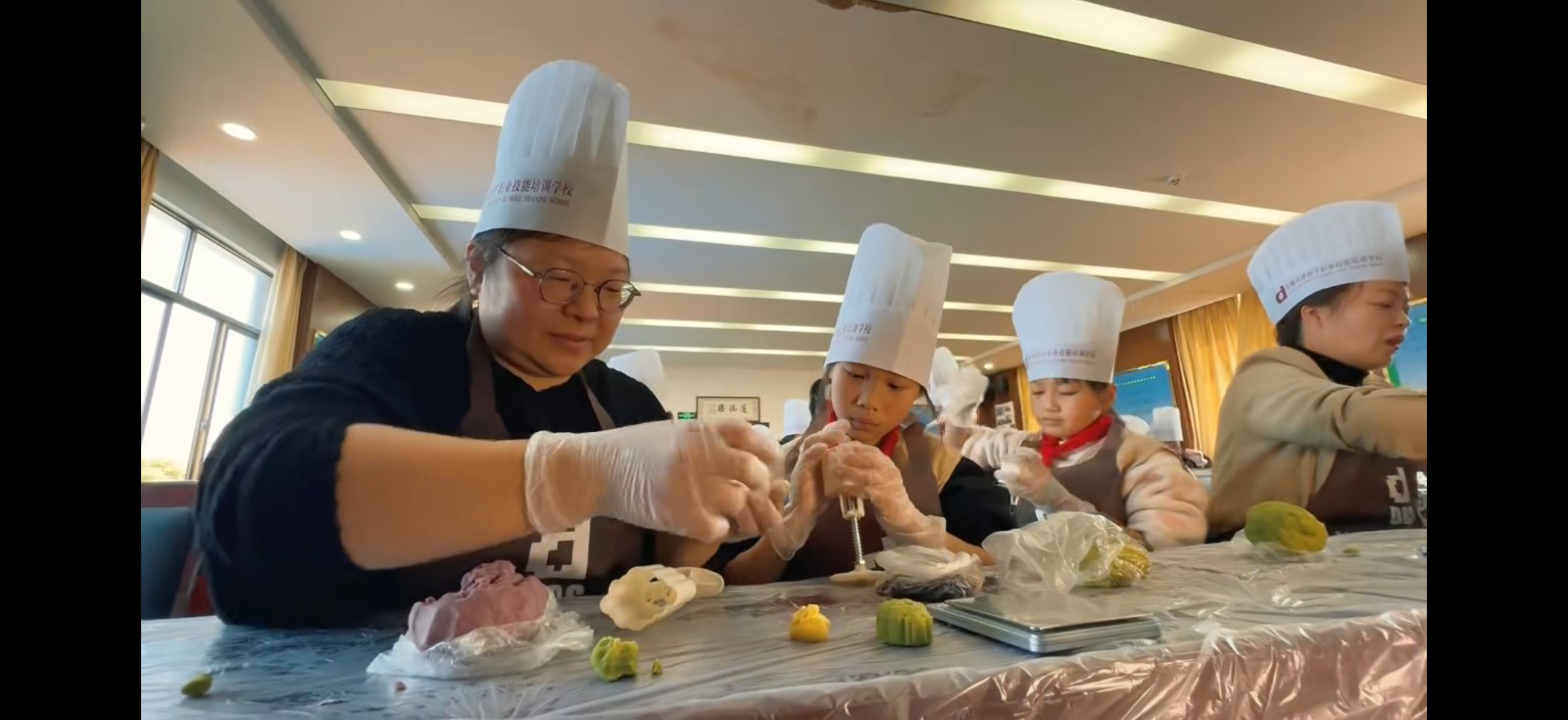活动现场,小朋友们“妈妈”们两两组合,在专业糕点师详细讲解里糕点制作的步骤和技巧后,大家纷纷动手,相互合作,通过不停地调色、揉粉、包馅儿、压膜等多道程序,每一道工序都充满了欢声笑语,糕点师耐心地指导,大家认真地学习,互相交流,其乐融融。经过一次又一次的尝试和创新,一个个紫绿相映、造型精致、香甜软糯的葡萄糕就新鲜诞生了。