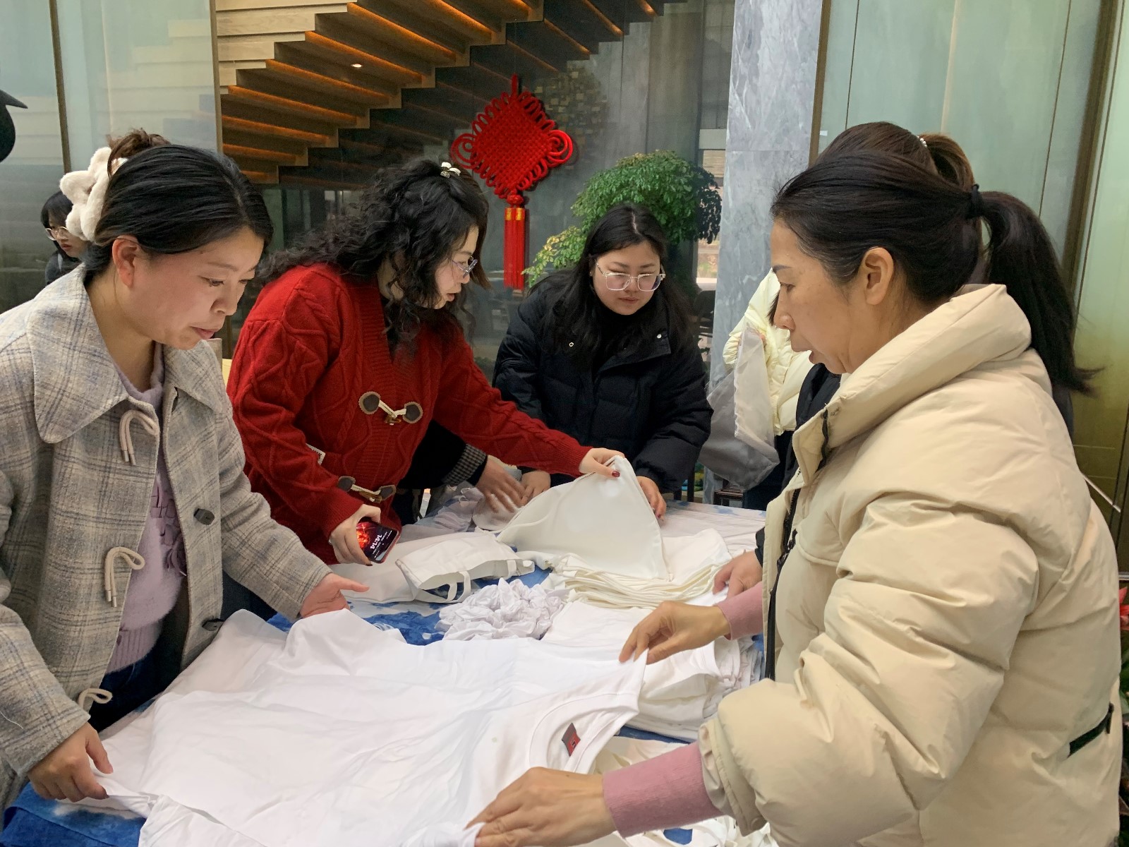 活动当天,在浃江巧妇非遗工作室负责人王丽的引导下,白峰街道工作人员们依次参观了扎染多个艺术品展区。展台上陈列的精美作品令大家赞叹不已——色彩斑斓的扎染布艺、制作精妙的扎染旗袍、别出心裁的发饰、包挂……每一件作品都凝聚着非遗手艺人的智慧与匠心。在实践环节,王丽老师演示了折叠、捆扎、浸染、氧化等扎染步骤,大家根据自己的喜好,选择制作服饰、发饰、包袋等,化身“非遗匠人,用皮筋、棉线等工具进行创意扎结,再进行染色,每一件作品都凝聚着女性的巧思与匠心。活动现场欢声笑语,在制作中增进情谊。