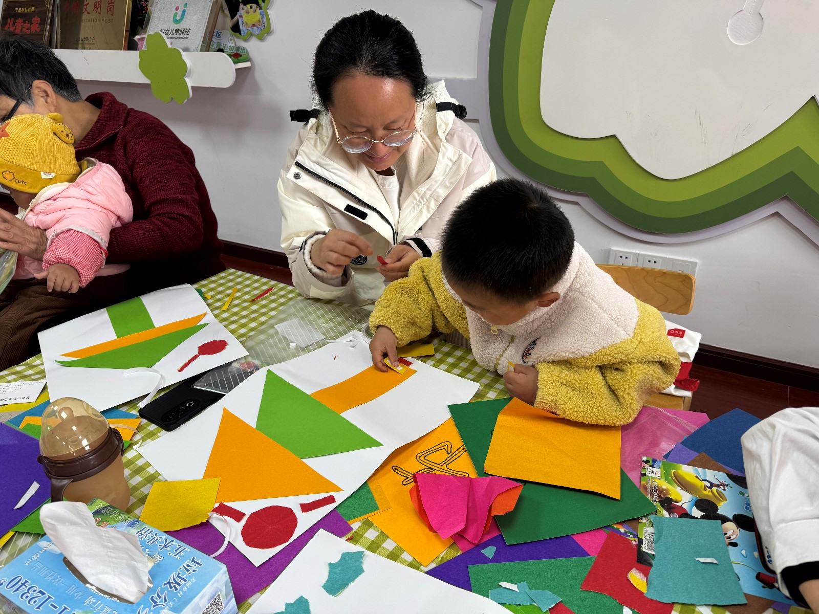 活动的重头戏是亲子撕纸粘贴大树手工环节。养育员为每组家庭分发了彩纸、胶水和画板,鼓励家长与孩子共同创作。小宝宝们用小手撕出五彩纸片,家长则协助拼贴出树干、树叶和花朵的形状。一位参与活动的妈妈表示:“孩子虽然才2岁,但撕纸和粘贴的过程锻炼了他的手部精细动作,还能让他感受到‘种下一棵树’的成就感。”活动现场,一幅幅充满童趣的“大树”作品逐渐成型,有的树上贴满“果实”,有的树下点缀“垃圾分类箱”,创意十足。参与活动的家长纷纷表示,活动不仅让孩子感受到自然与环保的重要性,也让自己学到了如何在日常生活中引导孩子践行绿色理念。