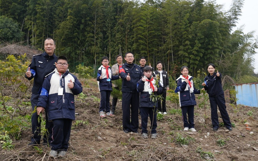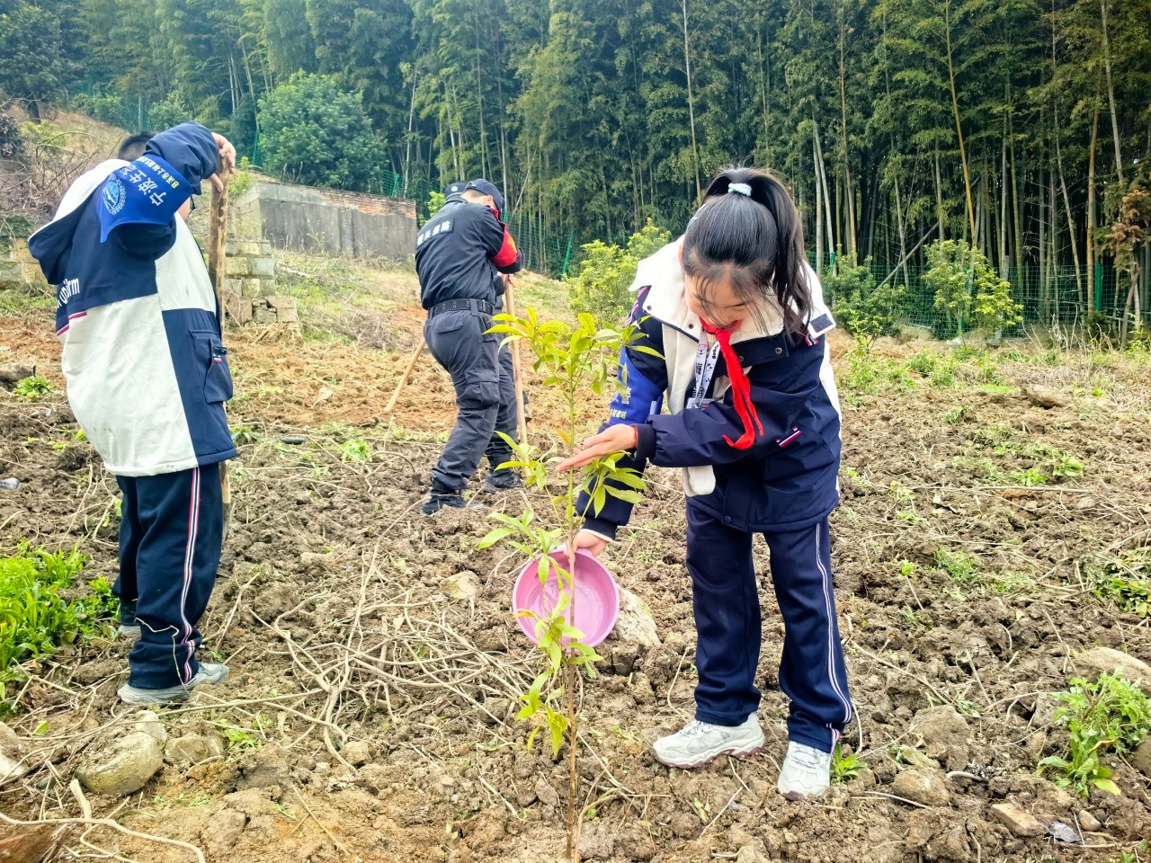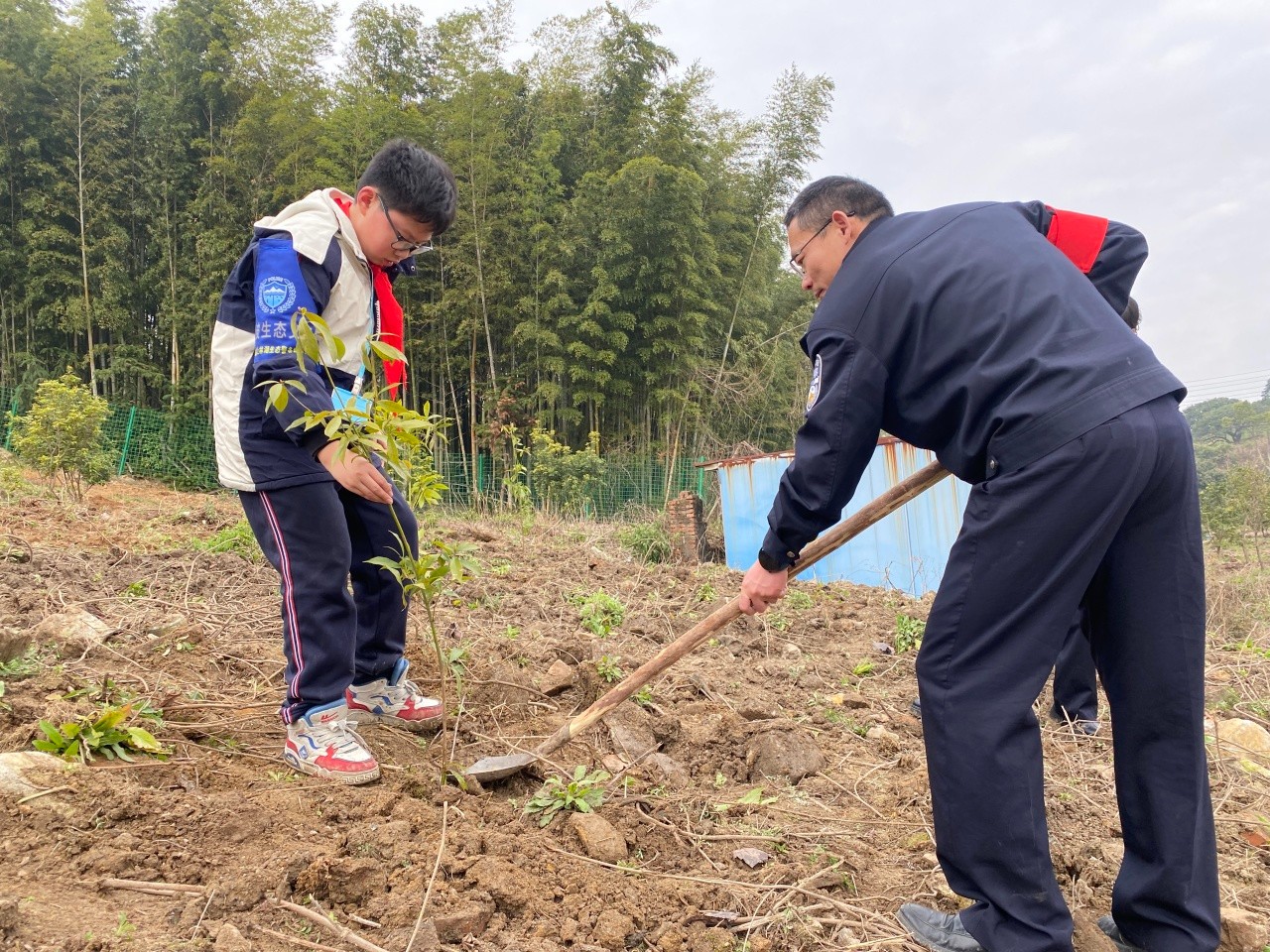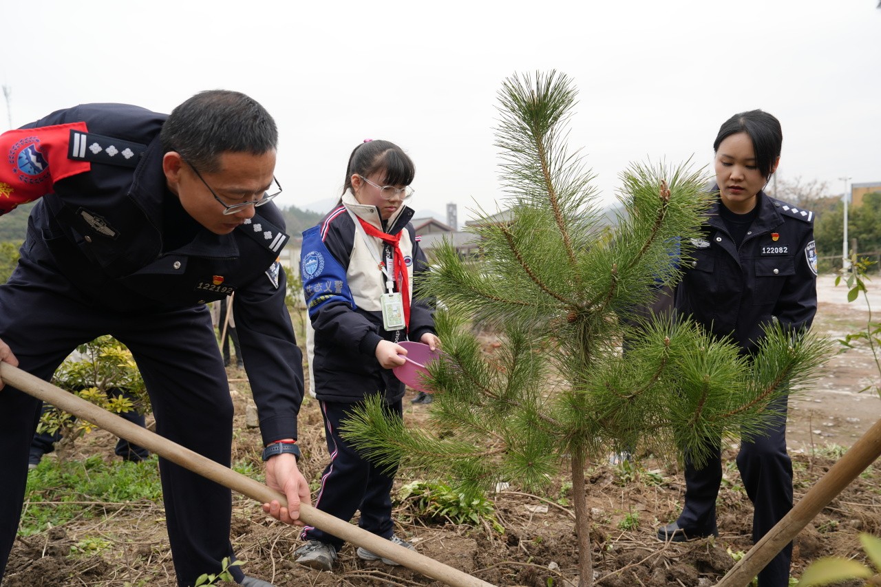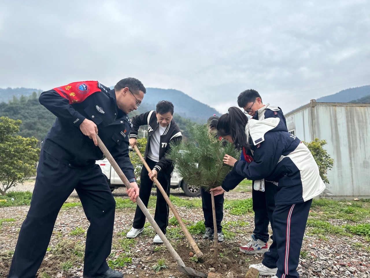 活动中,生态警长徐达带领派出所民辅警、青少年、村干部等20余人挥锹铲土、挖坑种树、提桶浇水,大家相互协作、分工明确、有条不紊,共栽下松树、楠木等苗木40余棵。此次活动通过“警校村”三方联动,既在春天播撒了绿意,让大家在劳动中强化了生态保护宣传意识,也是用“公安蓝”守护“生态绿”的新时代警务工作的生动实践。