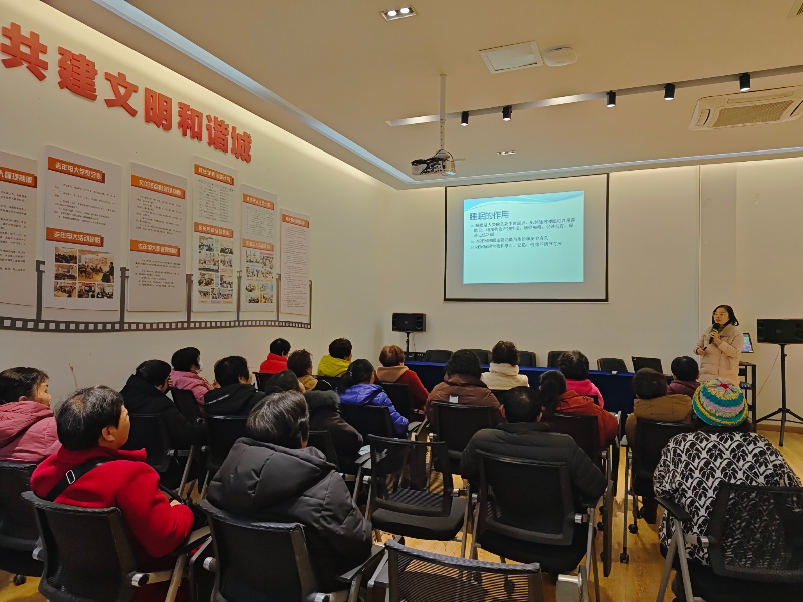 随后,北仑人民医院精神科倪敏医生还为大家带来了一场实用的睡眠健康讲座。倪医生针对老年人常见的入睡困难、多梦易醒等问题,深入浅出地讲解了睡眠周期规律。“睡前温水泡脚”“午睡不超过30分钟”“白天适量晒太阳”……这些实操性建议引发了阵阵讨论。“原来晚上睡不着是因为白天不太运动,回去我就好好调整。”学员贺阿姨在咨询环节得到个性化建议后感慨道。