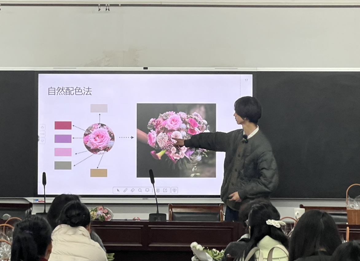 本次培训邀请了国家插花花艺高级技师、浙江省首席技师潘军老师全程授课。潘老师以“现代花艺设计与美学”为主题,向老师们介绍了传统插花的分类,重点讲解了插花设计的六大原则,即“色彩的和谐搭配、层次的错落有致、比例的协调适度、造型的独特新颖、质感的巧妙融合、平衡的精准把握”。“块状花如玫瑰、百合,是整个插花作品的焦点;线状花如马蹄莲、紫罗兰,则起到勾勒线条、延伸空间的作用。创作时应以块状花为基础,巧妙搭配其他花形……”潘老师以理论穿插案例娓娓道来,部分学员则已迫不及待地拿起剪刀修剪花枝,对实操环节跃跃欲试。潘老师见状笑言:“插花也看性格,心急的老师会很快完成。”此话一出,引得现场阵阵笑声。