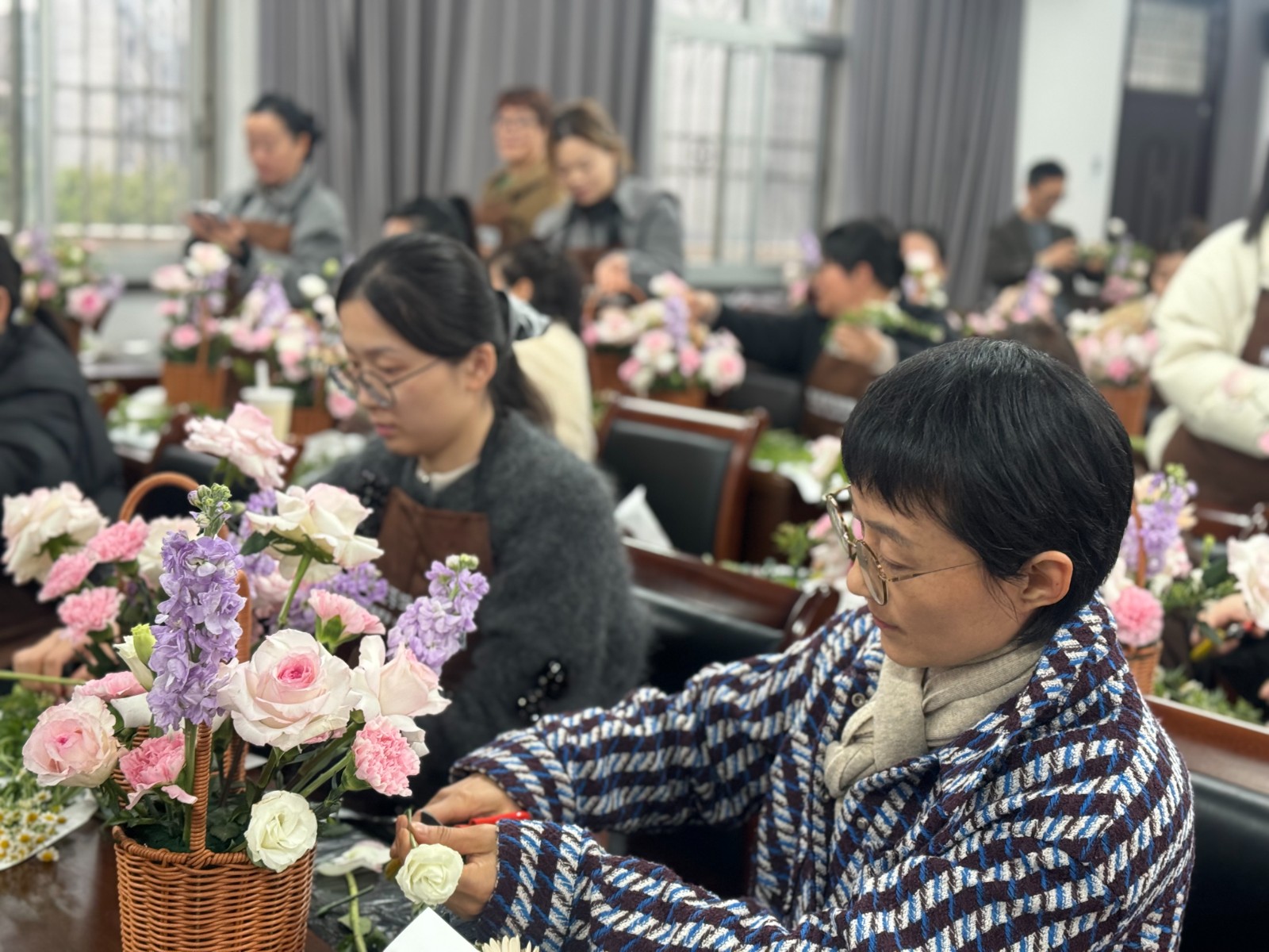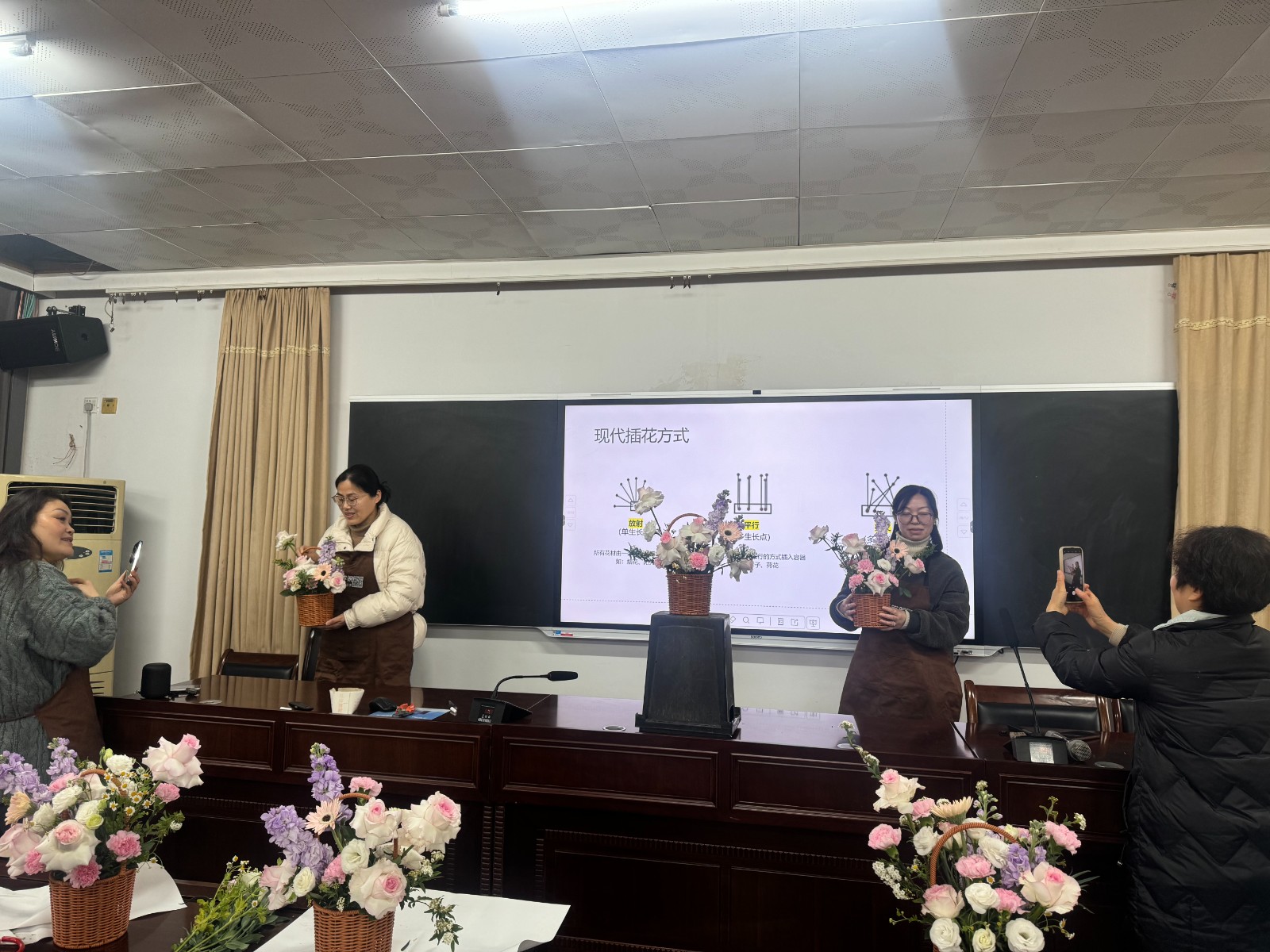 终于到了学员们动手创作的环节,大家摩拳擦掌、兴致盎然,尽情享受插花的乐趣。不一会儿,一盆盆造型别致、娇艳动人的花篮在大家的巧手下诞生。学员们纷纷手持自己的作品合影留念,记录下美好时刻。此次插花活动,不仅为教师们提供了在工作之余放松身心、缓解压力的机会,更激发了他们对生活的热爱和对美的追求。
