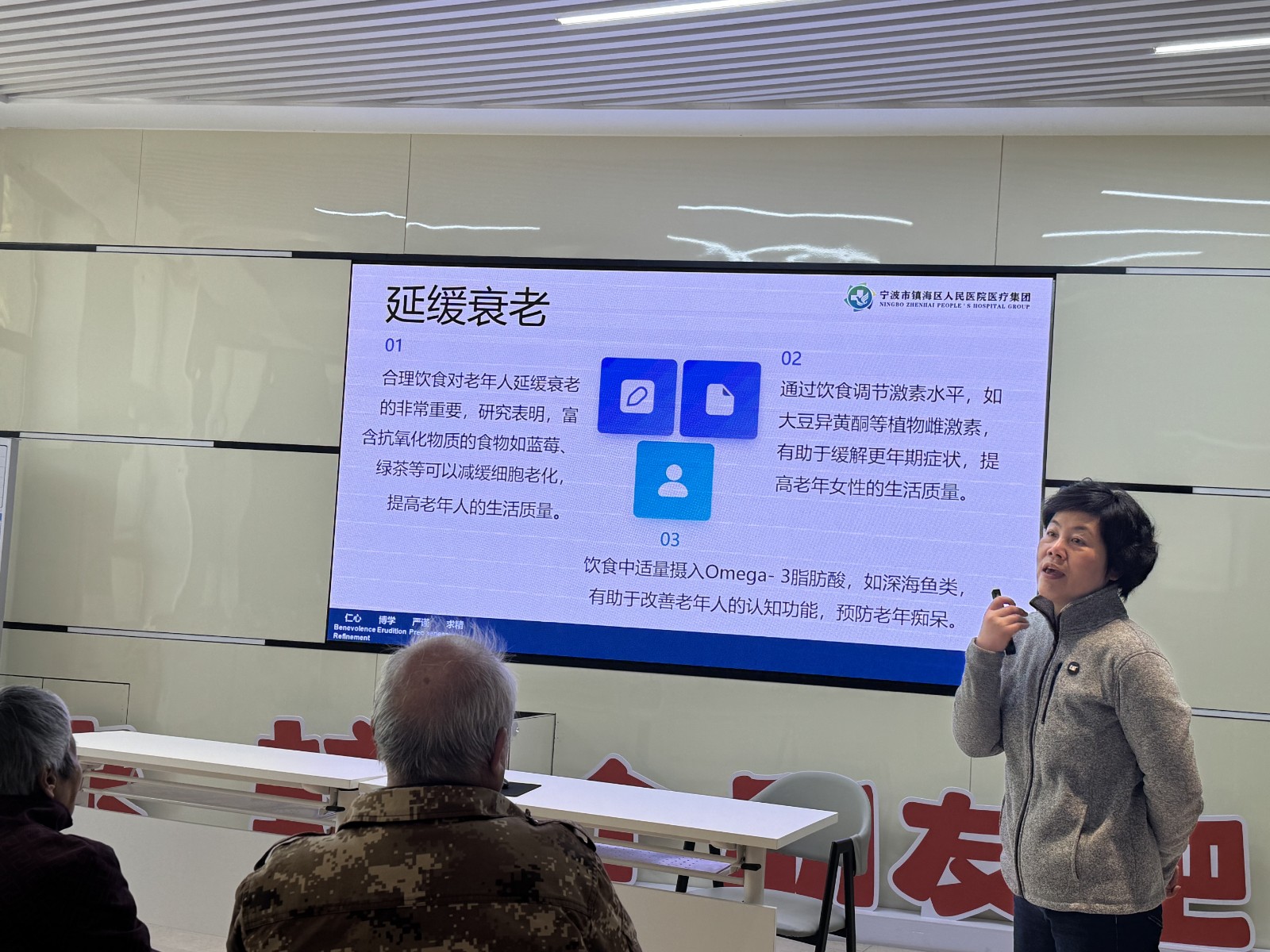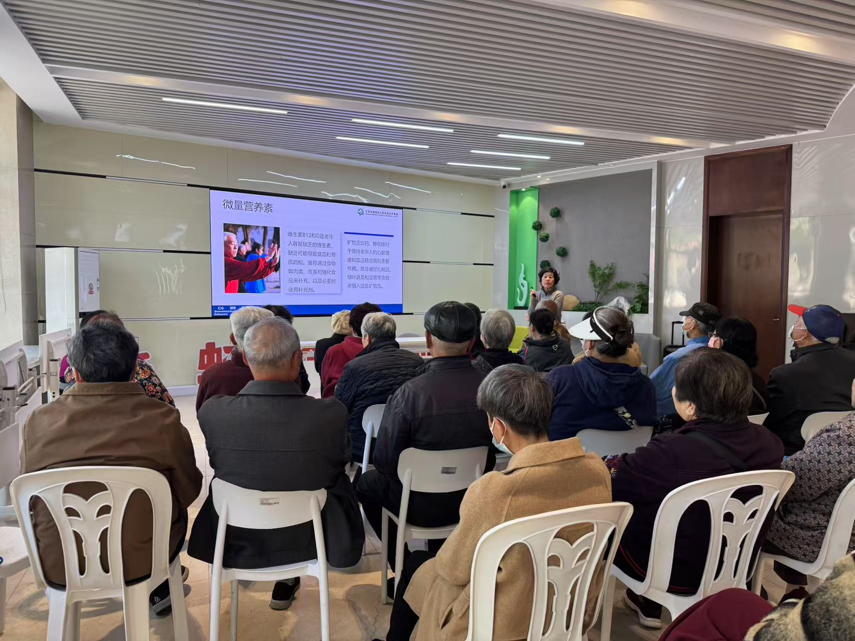 讲座中,盛蓉老师结合老年人的生理特点和常见疾病,深入浅出地讲解了健康食疗的重要性。通过生动的案例和通俗易懂的语言为老人们详细介绍了各类食物的营养价值以及如何进行科学搭配。在饮食建议方面,盛医生强调老年人应遵循“食物多样、谷类为主”的原则,多吃蔬菜、水果、全谷物和豆类,适量摄入鱼、禽、蛋、瘦肉,减少盐、油和糖的摄入。同时,她还针对不同疾病给出了具体的饮食调理方案,如高血压患者应低盐饮食,多吃富含钾的食物;糖尿病患者要控制碳水化合物的摄入量,合理分配三餐等。