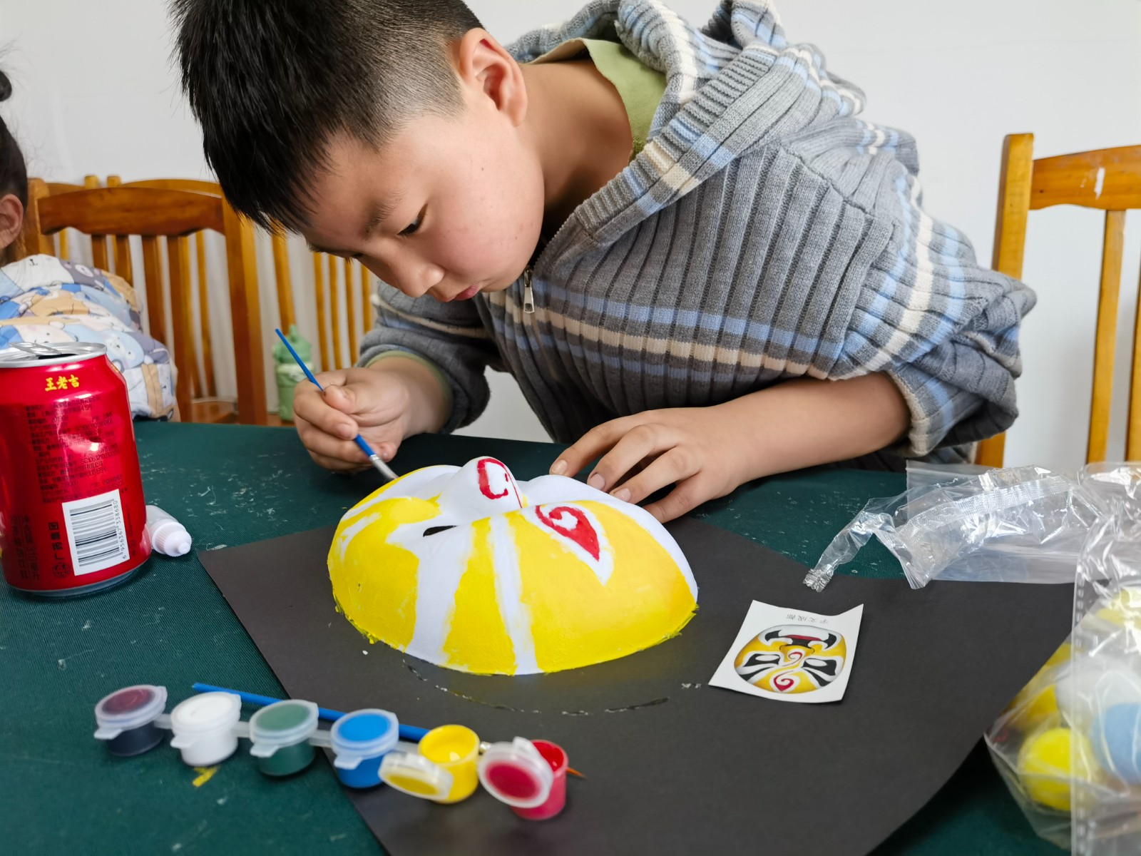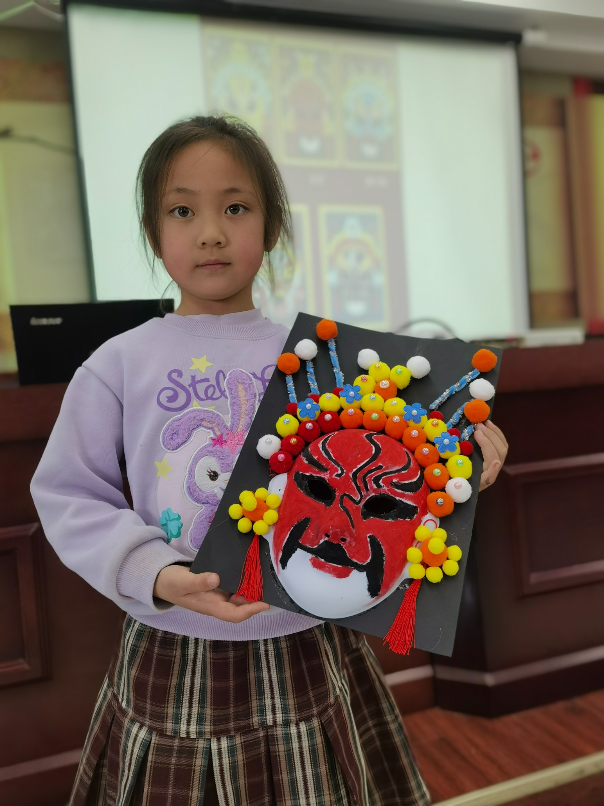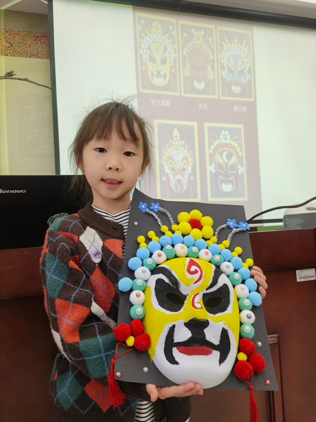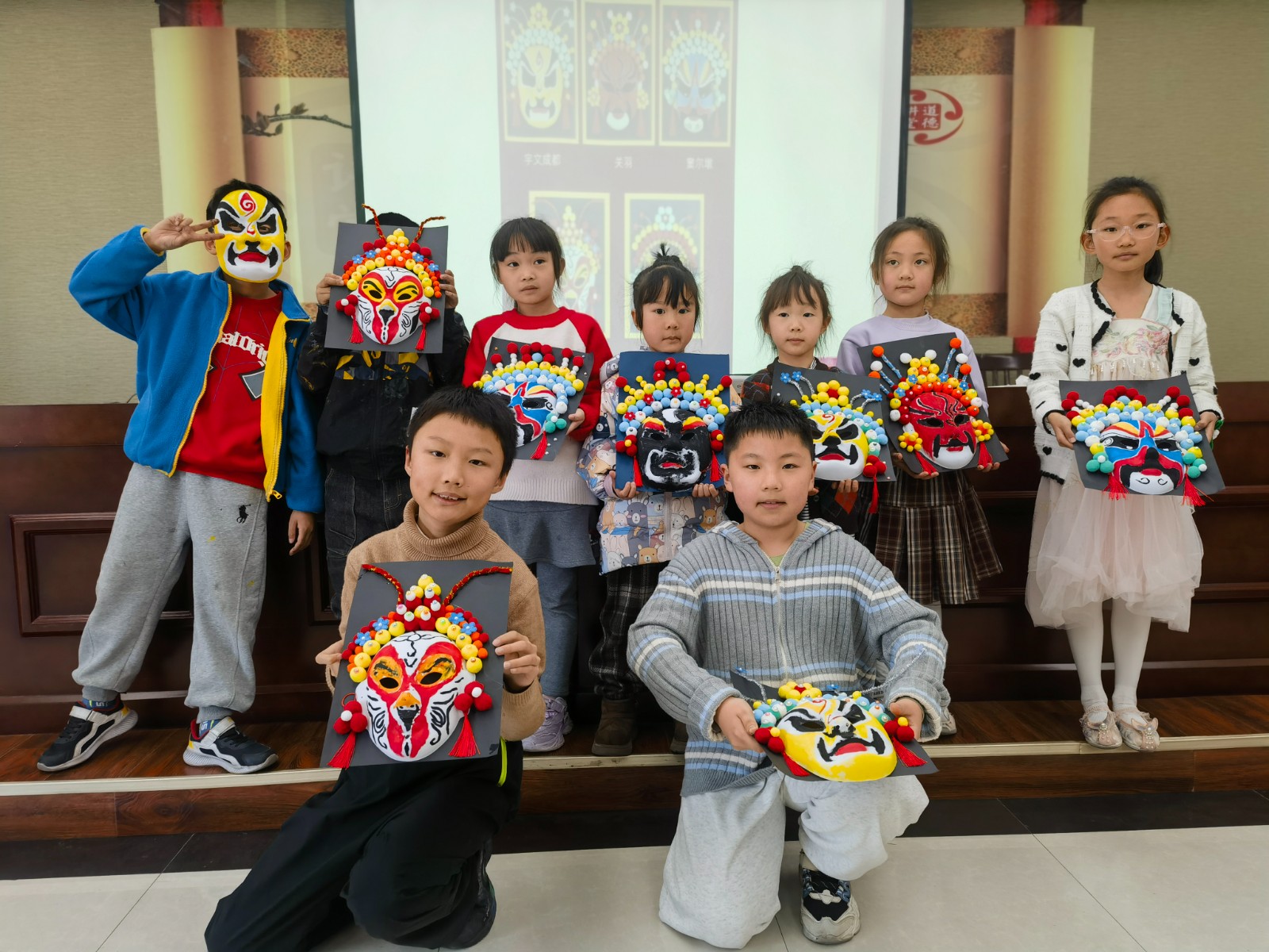 通过文化遗产知识课堂,同学们认识了精彩纷呈的物质文化遗产、魅力无限的非物质文化遗产,在赞叹中华传统文化的同时,也认识到了文化遗产是中华民族的瑰宝,是历史留下的宝贵财富,具有不可再生性和不可替代性。一抹丹青,勾勒千年风华。非遗脸谱,演绎世间百态。讲座结束后,同学们在老师的指导下,绘制国粹脸谱,制作京剧脸谱装饰画。红色代表忠诚勇敢如关羽,黑色代表正直无私如包拯,蓝色代表粗豪暴躁如窦尔敦,还有俏皮顽劣的孙悟空……无论是英勇无畏的武将,还是阴险狡诈的恶人,亦或是善良正直的君子,都在脸谱上得以生动呈现。这不仅展示了脸谱艺术的独特魅力,更是对生活百态的深刻解读。在创造中更深入地了解中国戏曲文化。