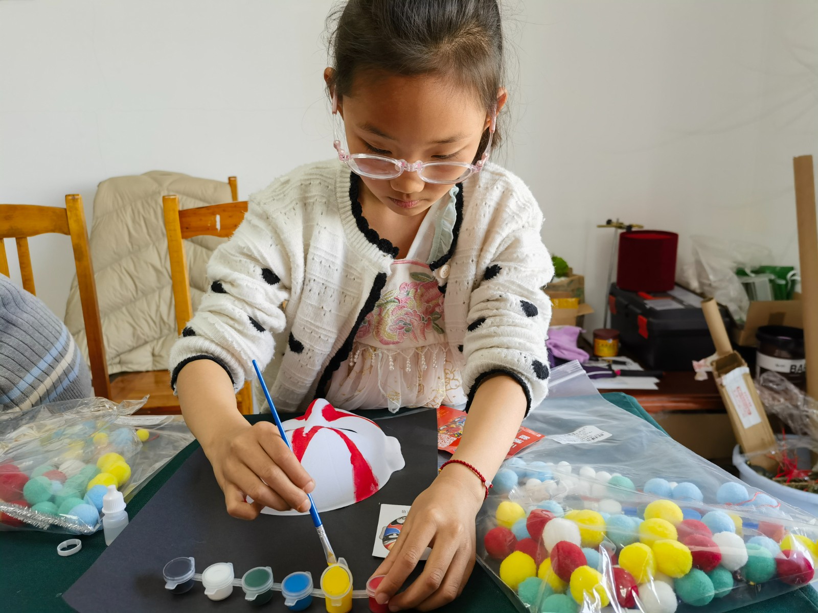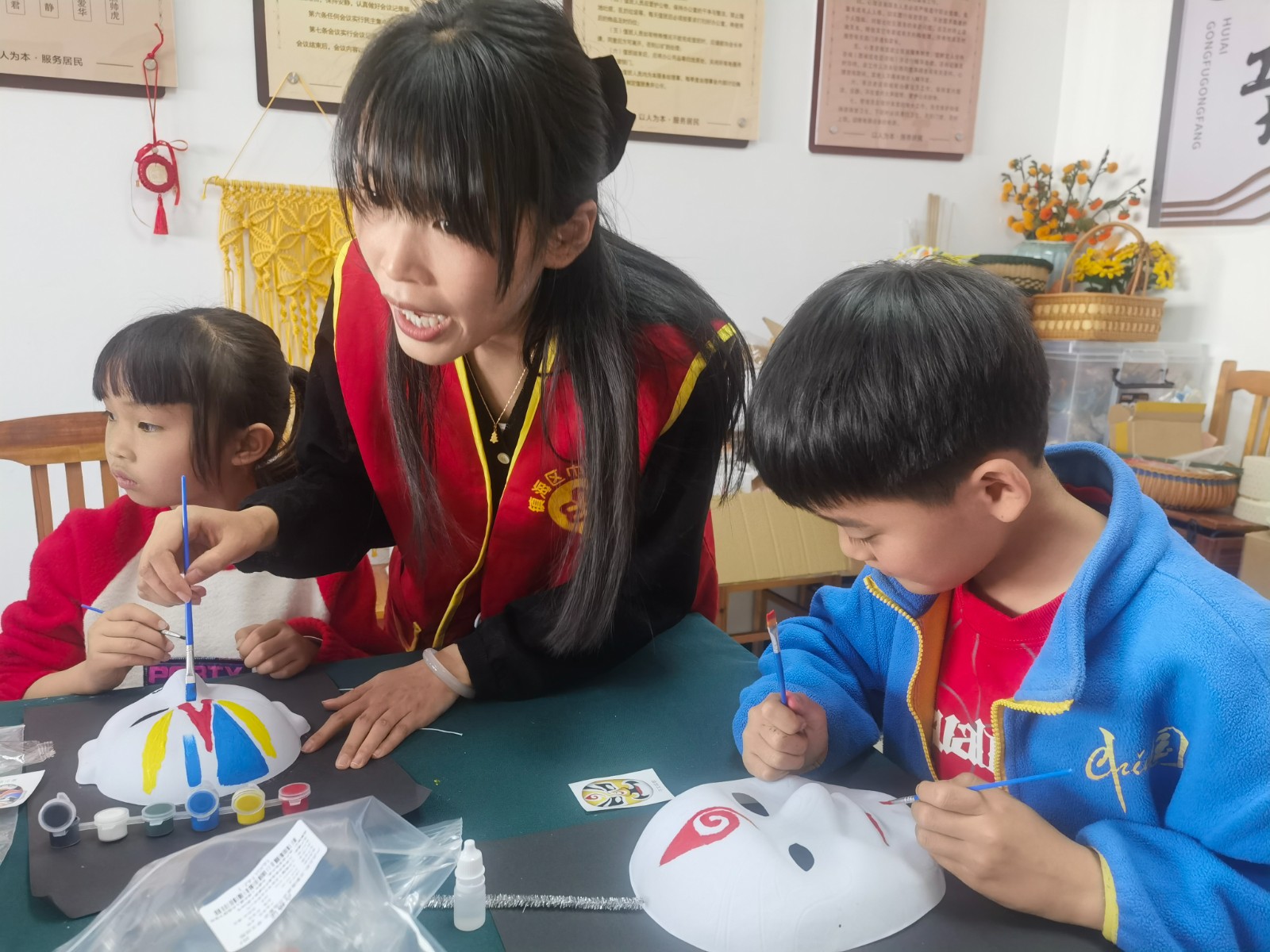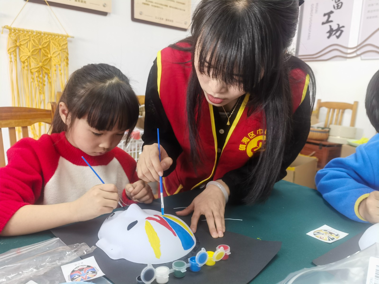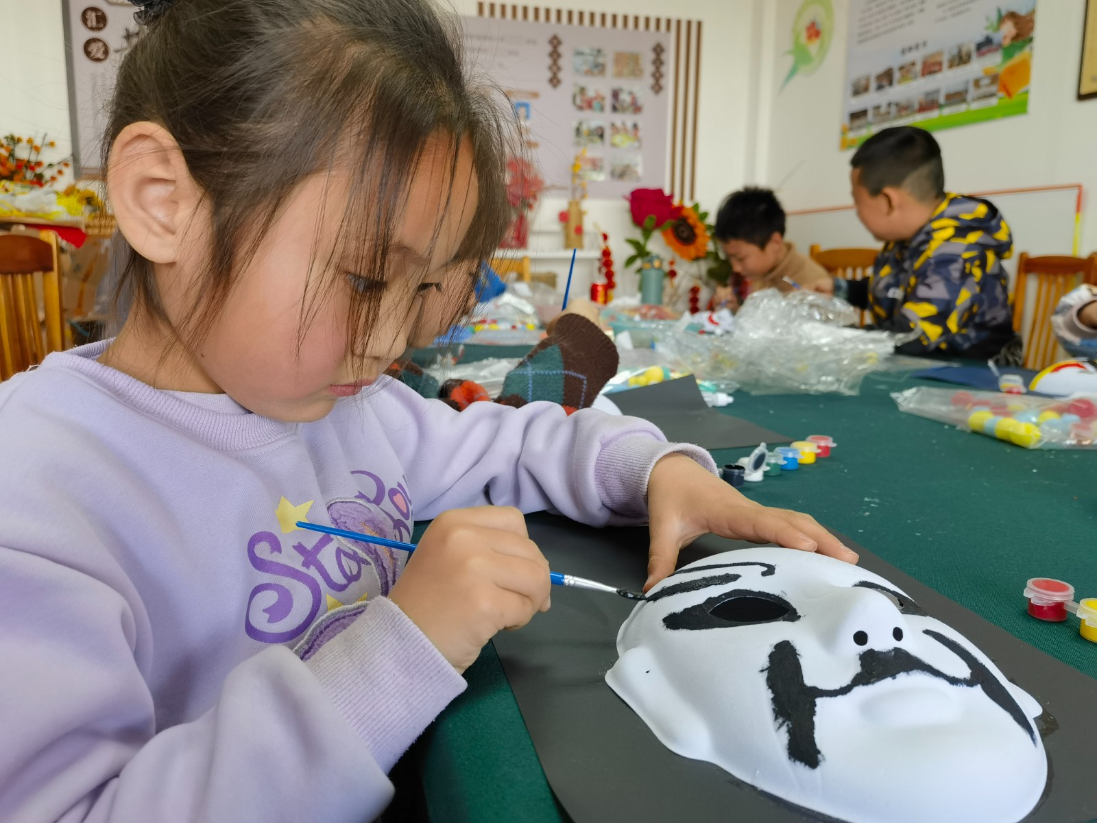 通过文化遗产知识课堂,同学们认识了精彩纷呈的物质文化遗产、魅力无限的非物质文化遗产,在赞叹中华传统文化的同时,也认识到了文化遗产是中华民族的瑰宝,是历史留下的宝贵财富,具有不可再生性和不可替代性。一抹丹青,勾勒千年风华。非遗脸谱,演绎世间百态。讲座结束后,同学们在老师的指导下,绘制国粹脸谱,制作京剧脸谱装饰画。红色代表忠诚勇敢如关羽,黑色代表正直无私如包拯,蓝色代表粗豪暴躁如窦尔敦,还有俏皮顽劣的孙悟空……无论是英勇无畏的武将,还是阴险狡诈的恶人,亦或是善良正直的君子,都在脸谱上得以生动呈现。这不仅展示了脸谱艺术的独特魅力,更是对生活百态的深刻解读。在创造中更深入地了解中国戏曲文化。
