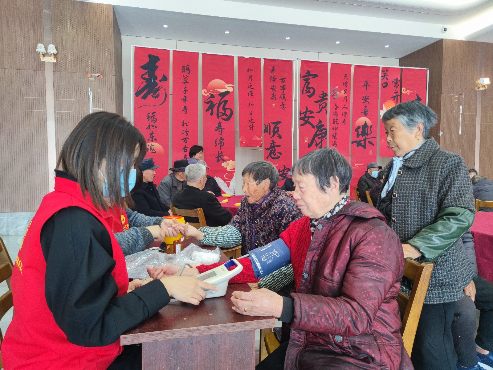 3月25日下午,梅山成校联合江梅社区为20多位80岁以上的高龄老人举办了一场特别的生日会。活动一开始,梅山卫生院的医生们为老人们提供了细致的健康服务,包括血压、血糖检测、健康咨询等,展现了社区对老年人健康的重视与关怀。