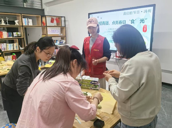 “青团起源于古代的寒食节,是一种用糯米粉和艾草汁制成的绿色糕点,是清明时节的时令美食。”活动中,授课的老师为大家介绍了清明节吃青团的由来及习俗,详细讲解了青团制作的工艺以及制作过程中的注意事项。随后,老师把提前准备好的面团和馅料拿出来,分发给青年们进行制作。拿到材料以后,青年们纷纷动手制作起来。搓、捏、压……在制作过程中,大家互相交流心得和技巧,分享自己的制作经验和感受,现场气氛热烈而温馨,充满了欢声笑语。不一会儿,一个个模样俏丽的青团就成型了,颜色鲜亮、香味四溢,大家一起品尝青团,感受传统美食的魅力。“我小时候,每年清明家里都会做青团,奶奶总是一边做一边给我讲清明节的故事,那时候觉得青团可好吃了,现在自己动手做,感觉特别有意义。”参加活动的青年居民袁园闻着青团的清香,高兴地与其他居民分享道。