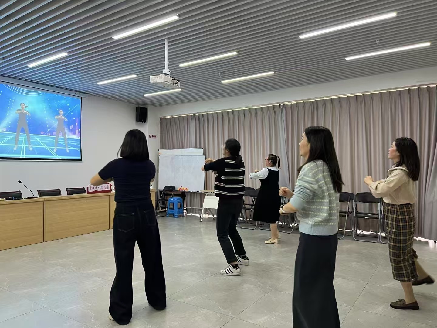 青年健身操则是参加的青年们看着视频先认真倾听动作讲解,然后跟着视频上的教学一遍遍练习,很快掌握了动作要领。最终,大家能够配合着音乐节拍尽情地展现自己,体验着健身操的魅力。