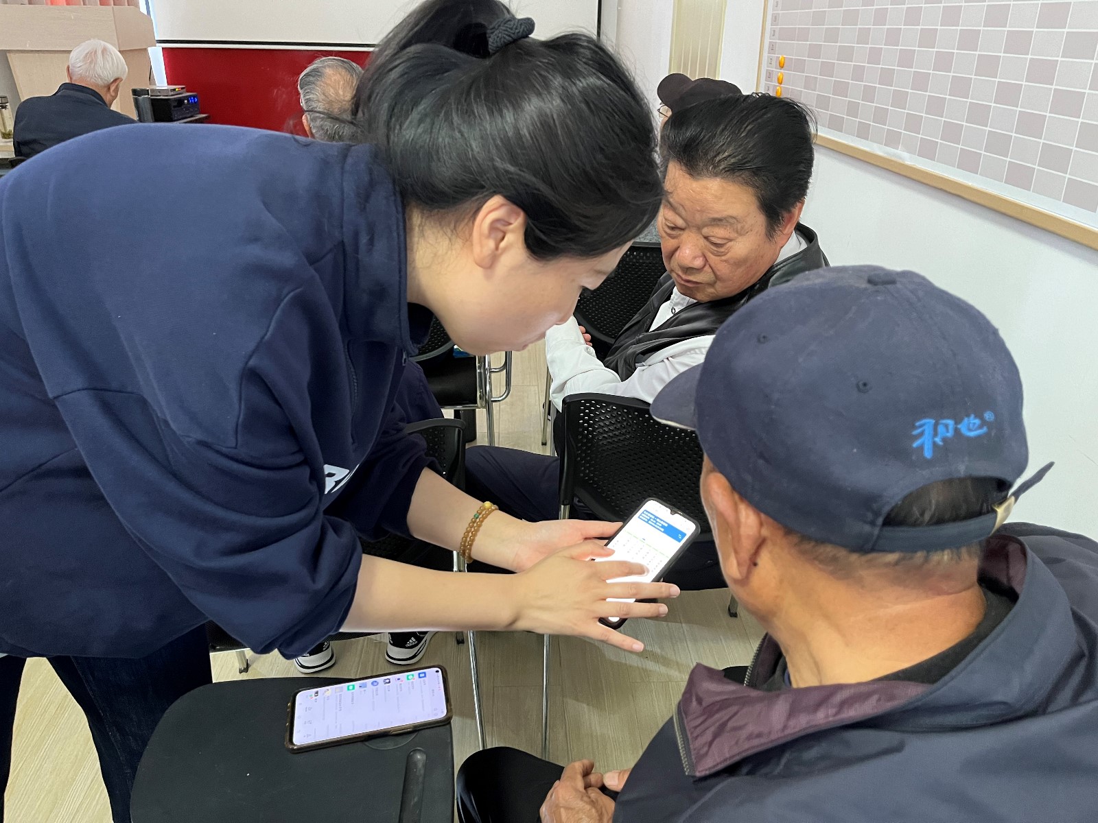 活动现场,社区工作人员化身“银发辅导员”,聚焦老年人高频生活场景,精心设计了"基础操作-安全防护-生活应用"三阶课程。前两个板块,工作人员演示了字体放大、亮度调节、语音输入等基础功能设置,重点讲解骚扰电话拦截与WiFi安全连接技巧。在生活应用模块,通过情景模拟教学,逐步指导老人使用医院挂号系统、公共交通实时查询及超市、菜场微信结账、转账等数字化服务。